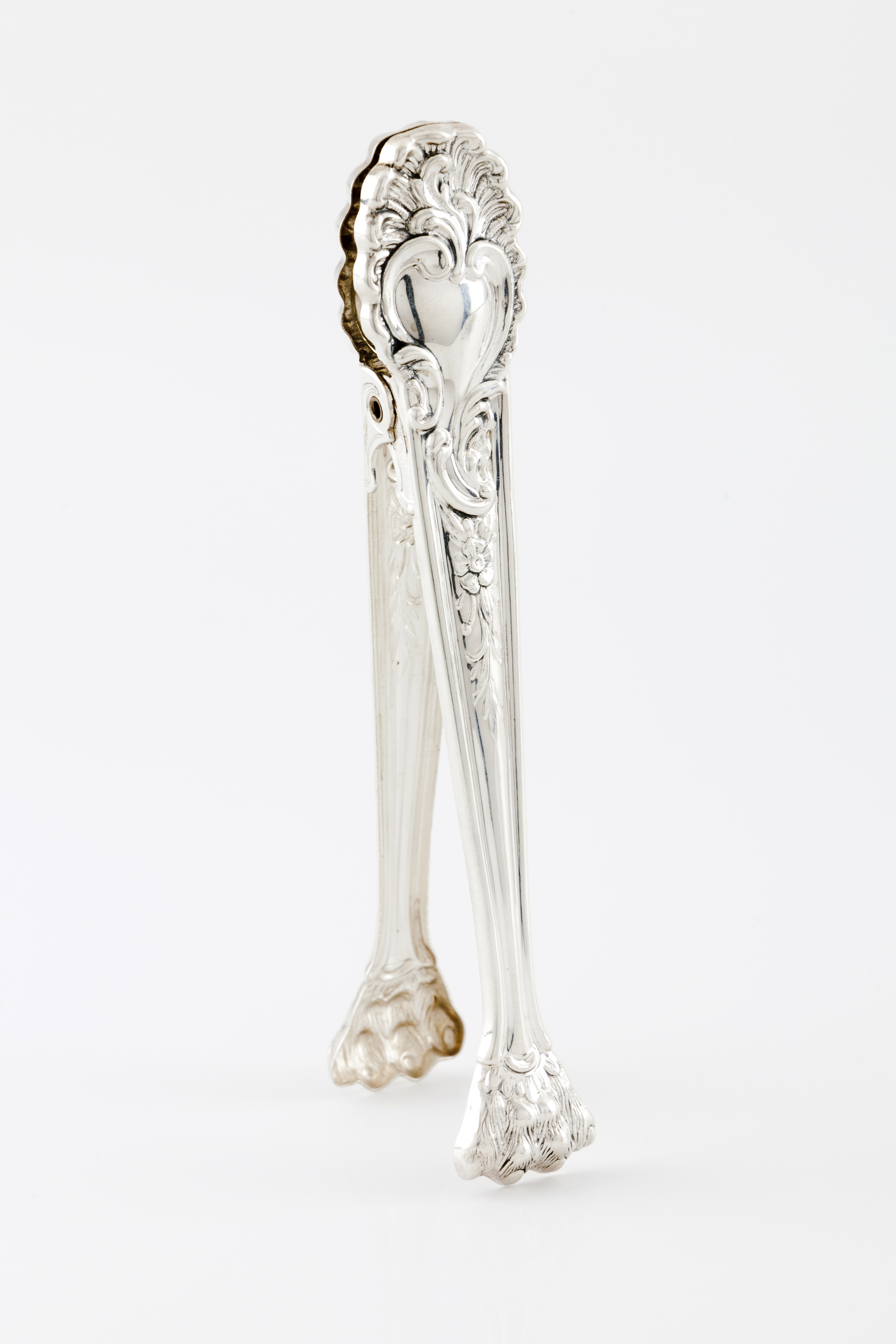 Decoração de acantos, flores, folhagem e cartela em formato de coração com pinças em patas de leão