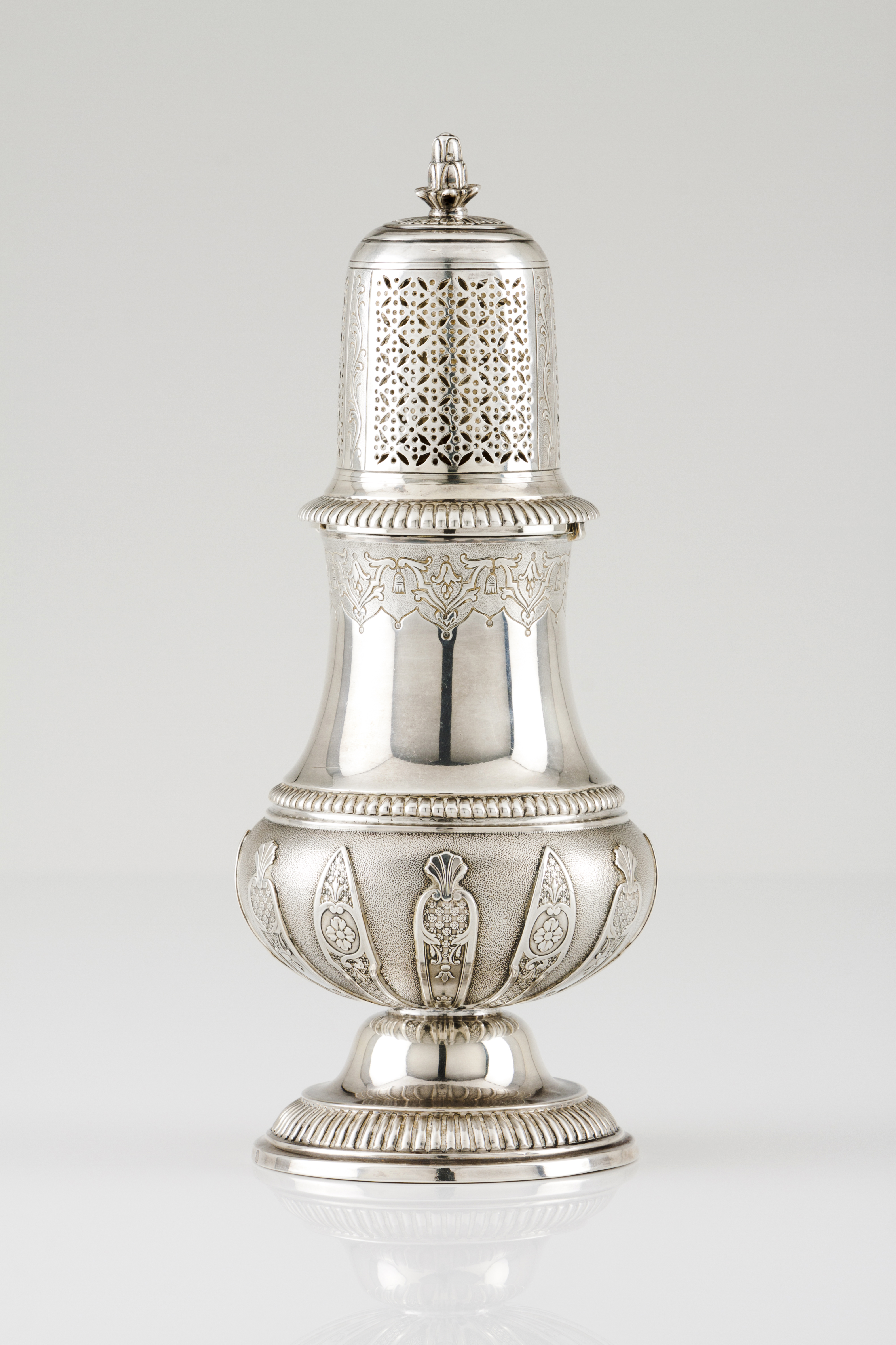 Produzido no final do séc. XIX, no apogeu do sucesso da Casa CARDEILHAC, este grande polvilhador de açúcar em estilo Regência, é de qualidade idêntica à dos melhores exemplos do seu tempo. Os vazados são delicados numa alusão a renda e o conjunto é pautado por uma decoração bem equilibrada fiel à linguagem decorativa da época Regência