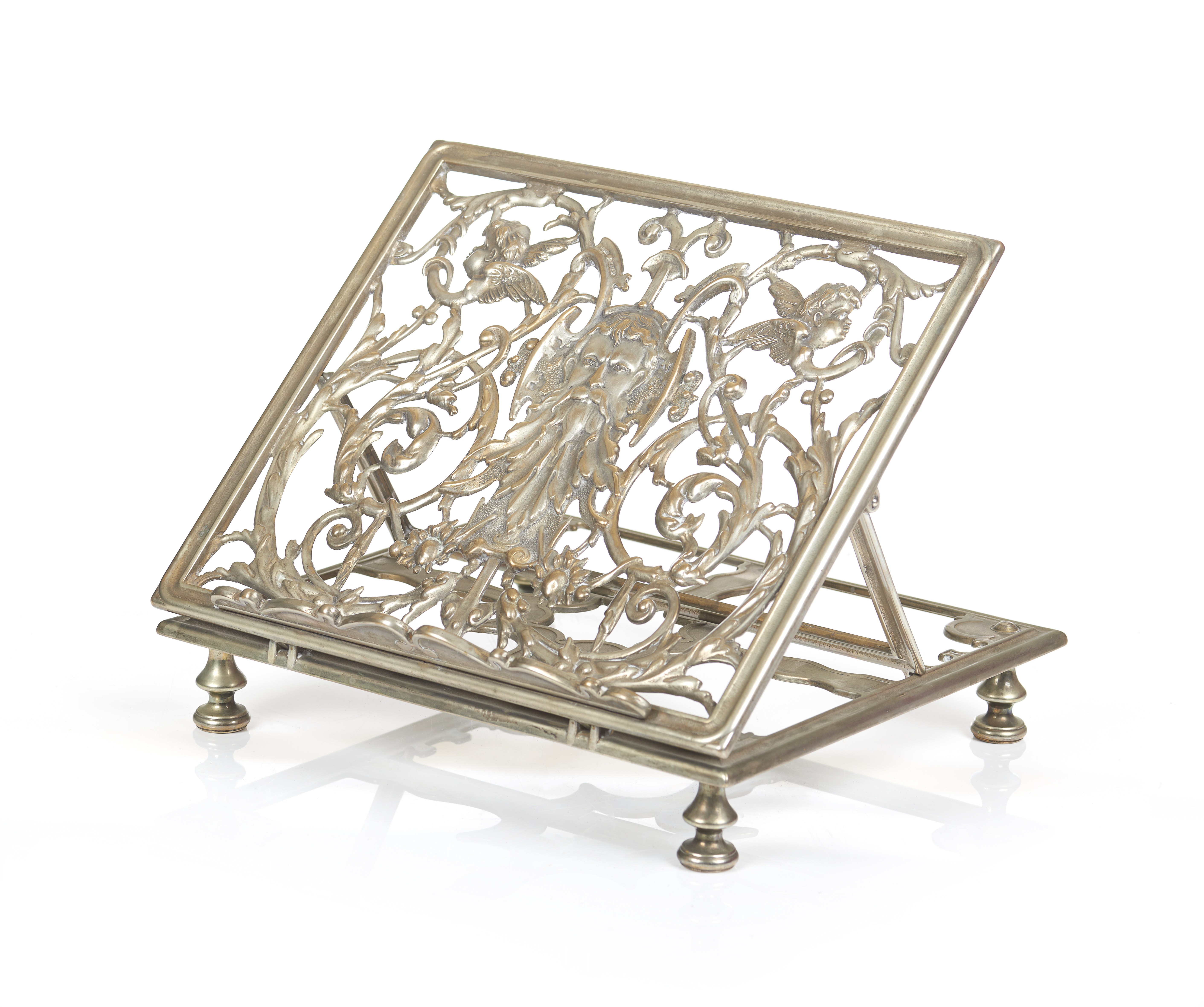 Em metal prateado e vazado decorado com figura e anjos