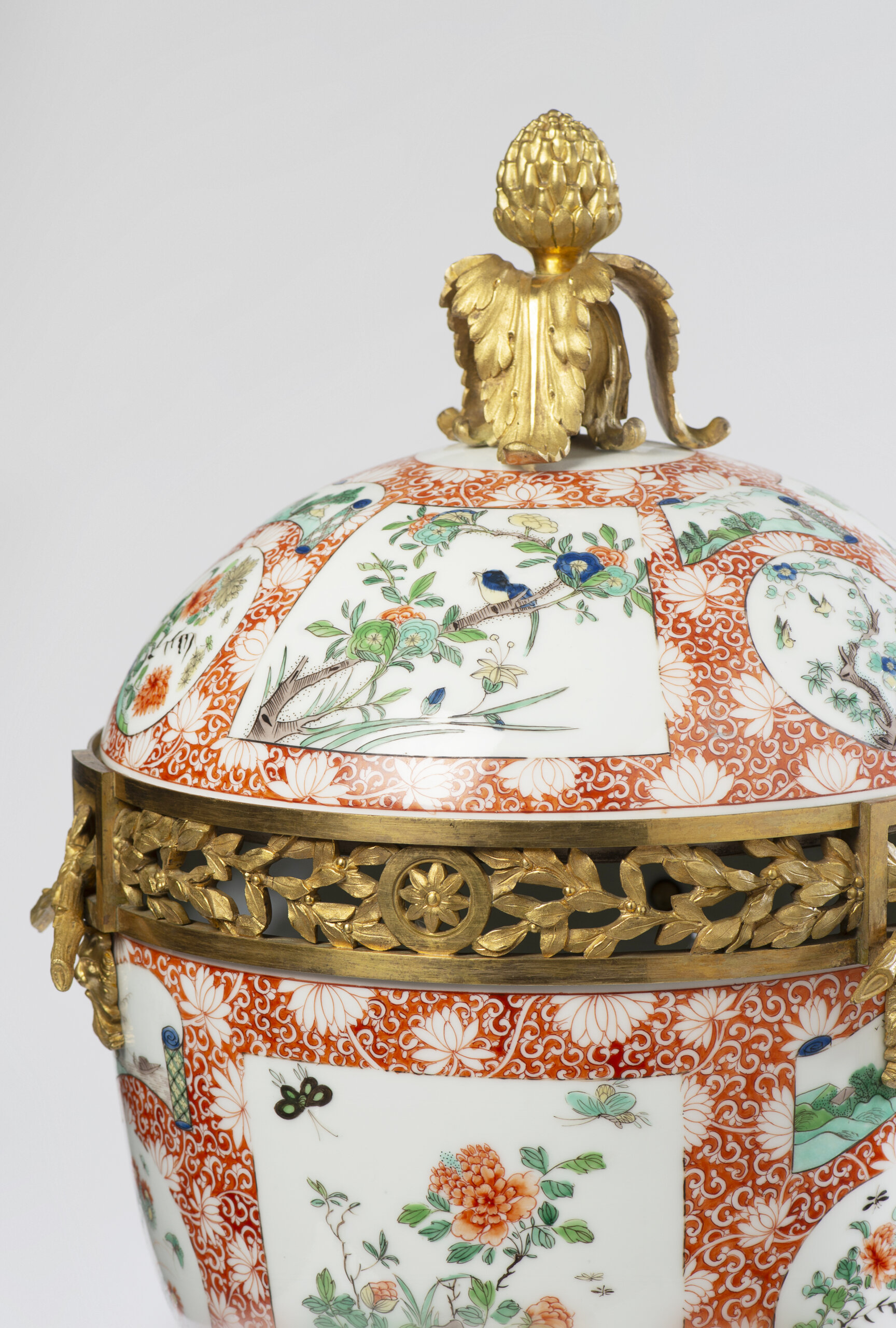 Taça em porcelana, de forma ovoide, com tampa em cúpula, decorada ao estilo da porcelana da China para exportação, com esmaltes da Família Verde. A superfície intercala reservas rectangulares com medalhões circulares, encimados por cartelas de forma scroll. As reservas rectangulares e os medalhões apresentam diversas composições com flores, plantas aquáticas, ramos floridos, pássaros e insectos, enquanto as cartelas em forma de scroll representam pequenas paisagens com figuras, pavilhões e rochedos. O fundo é preenchido com padrão a rouge-de-fer, composto por enrolamentos de flores de lótus estilizadas.