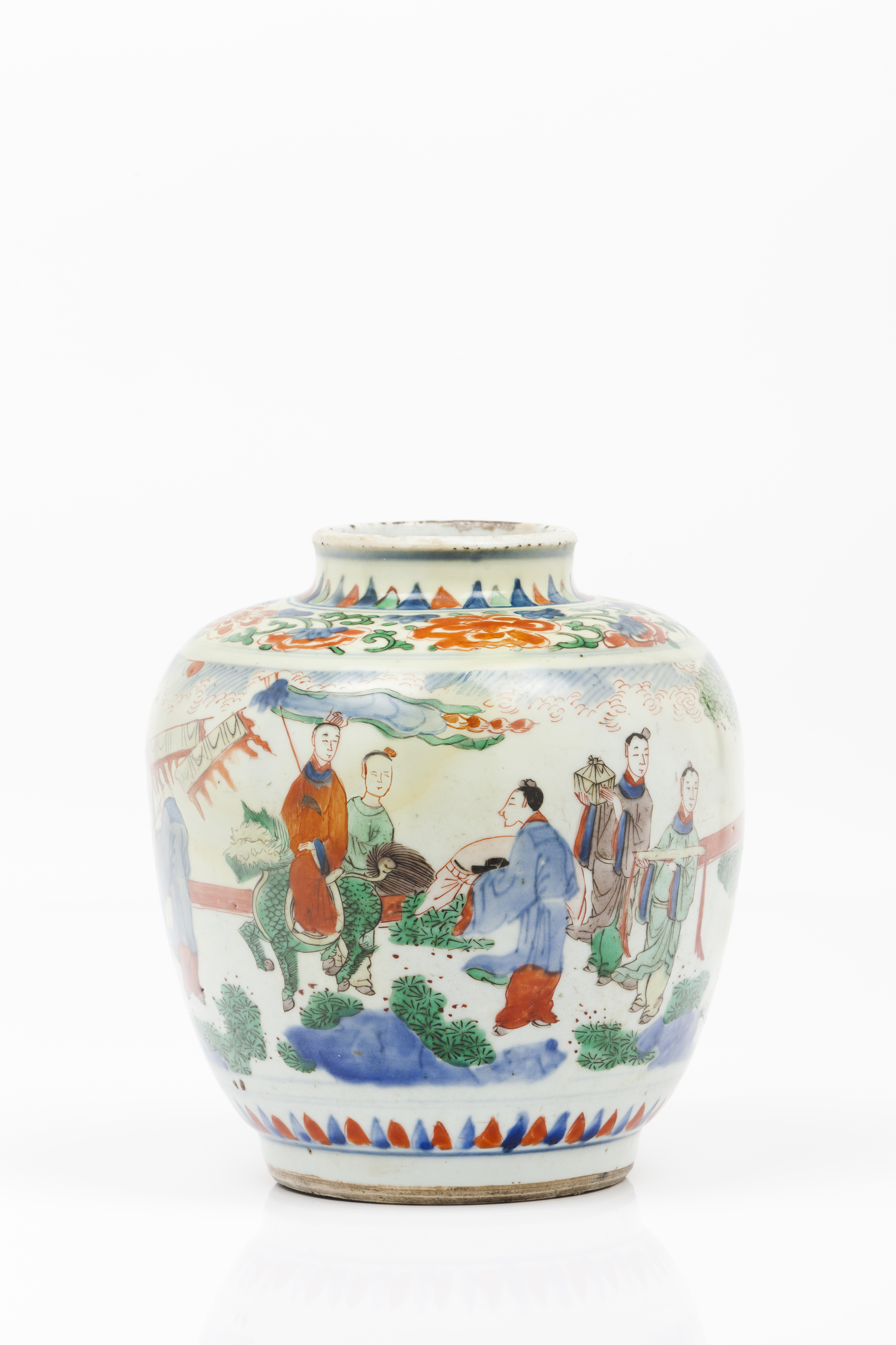 Representando vista de jardim com vedação, dois rapazes a montar um qilin, acompanhados por outros cinco a carregar bandeiras e oferendas