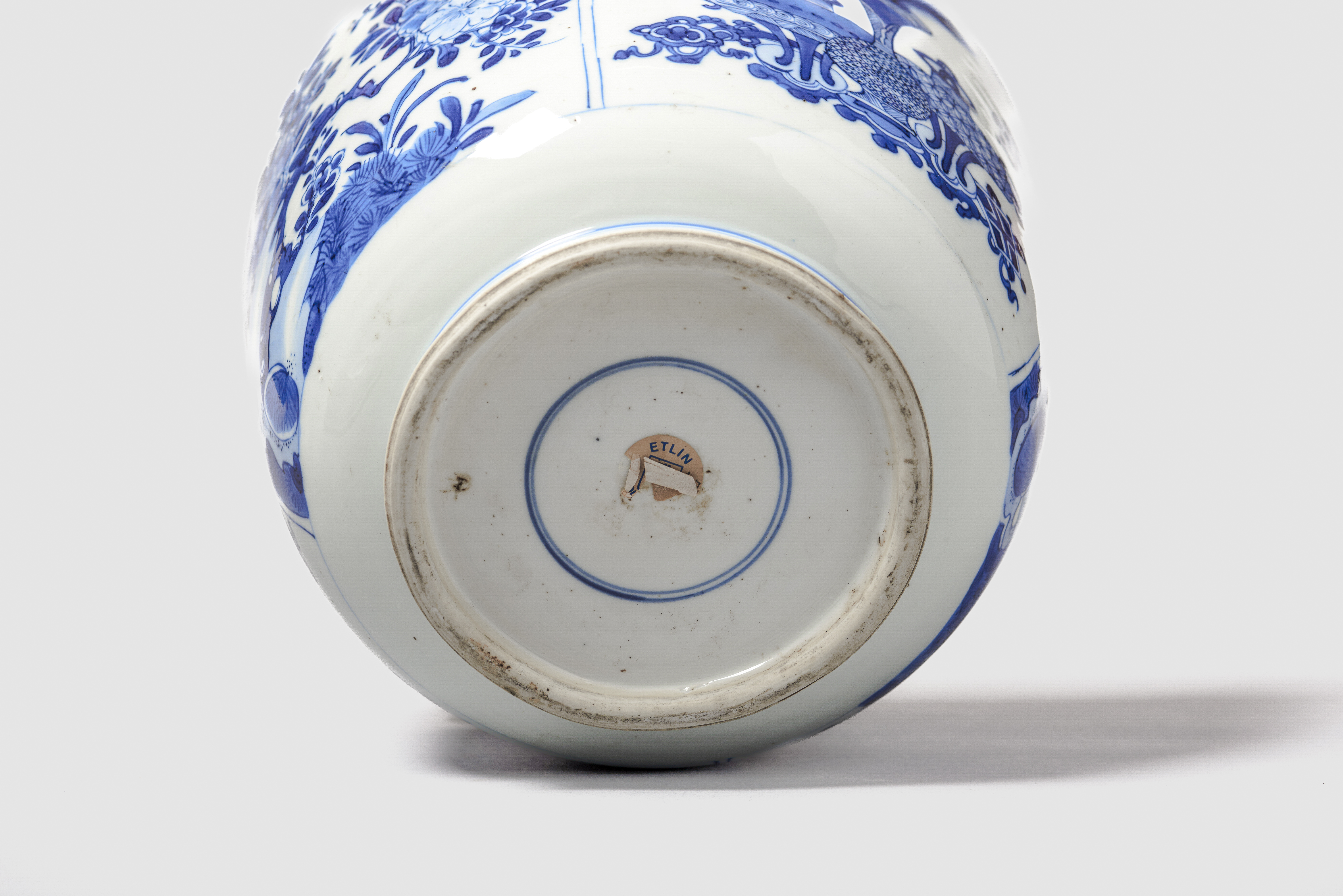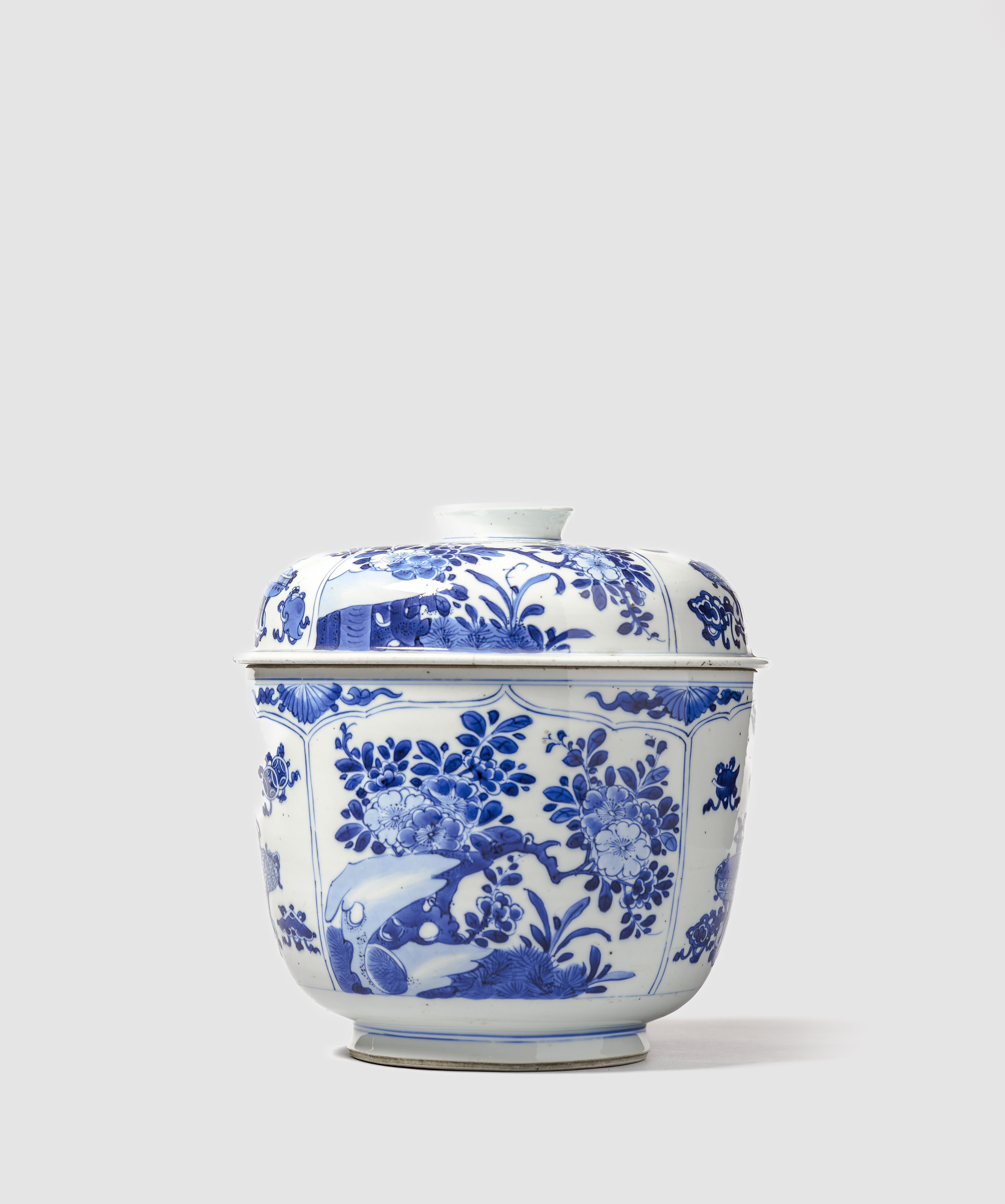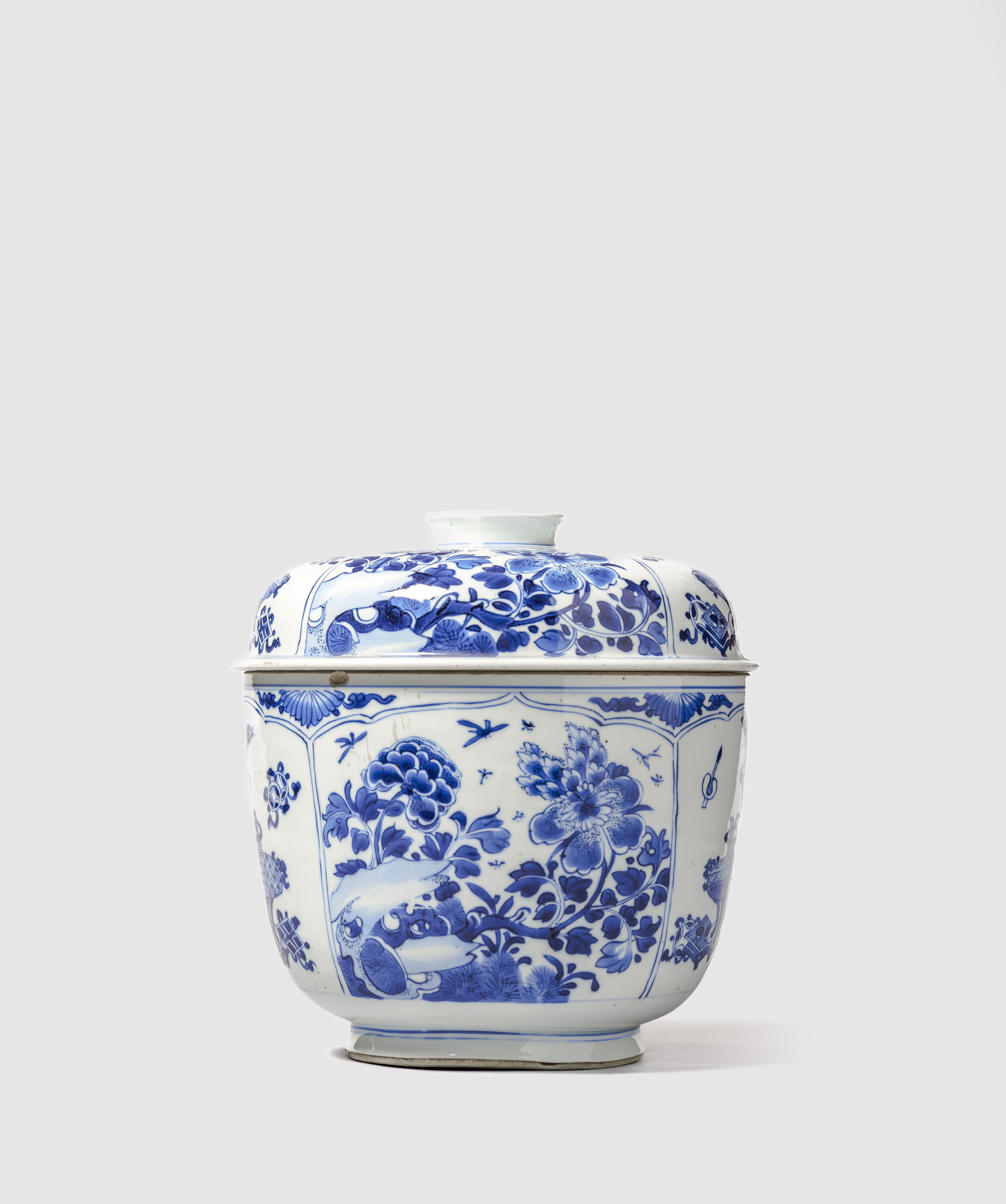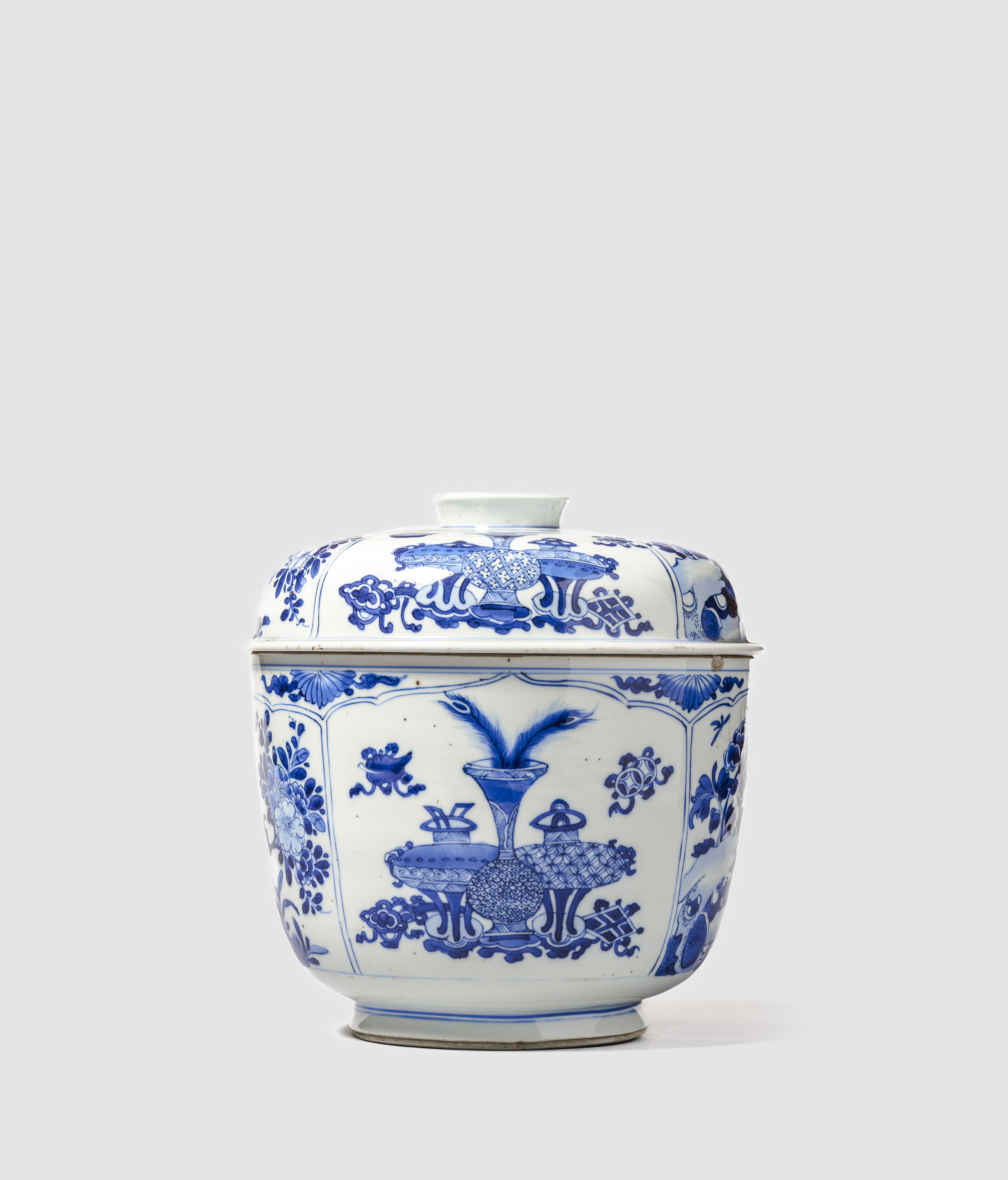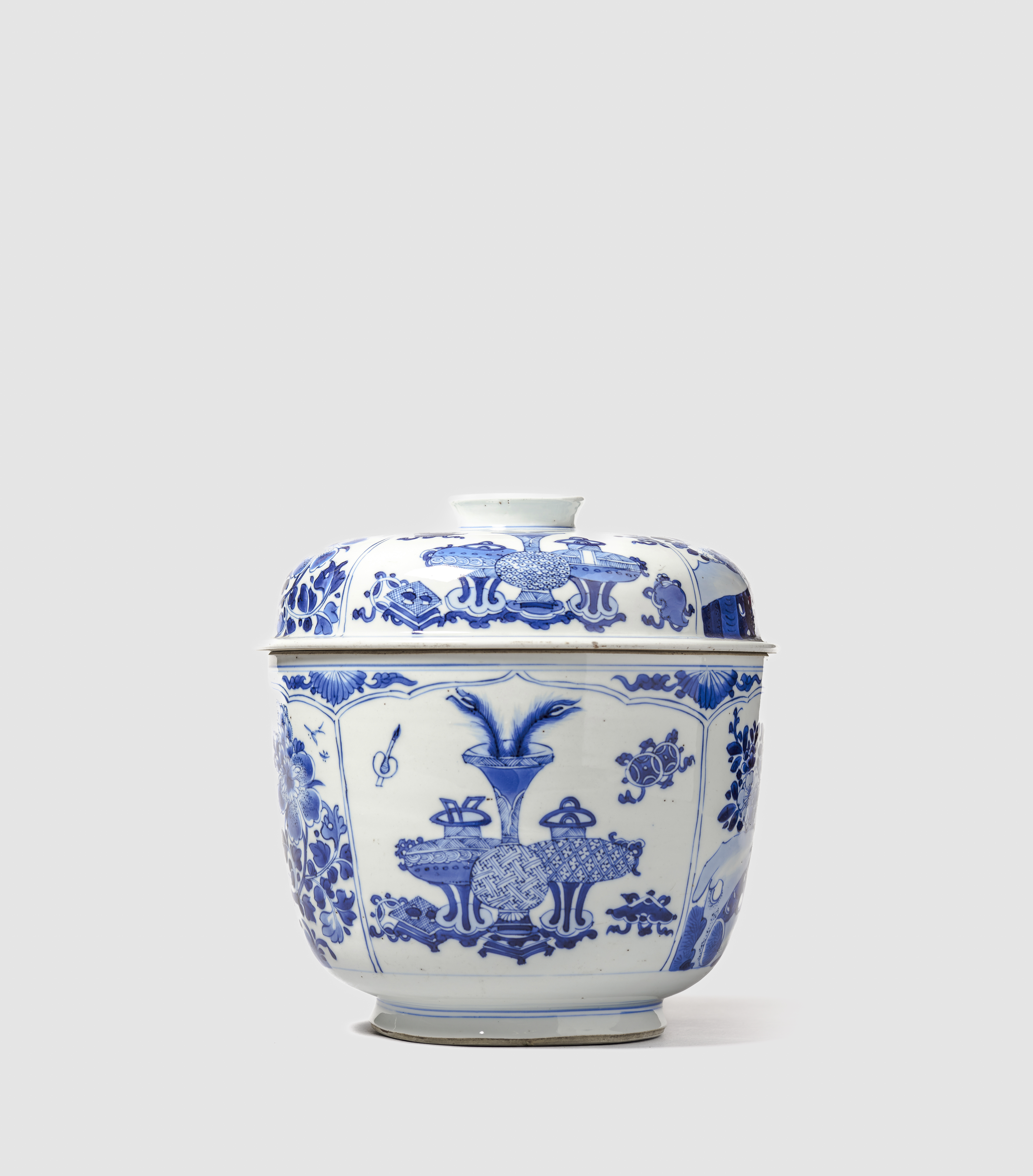 Em porcelana, de formato arredondado e com tampa ligeiramente abobadada. Pintada em tons intensos de azul, com quatro painéis recortados, intercalando no interior composições com objectos preciosos e paisagens com flores e rochedos. A tampa apresenta uma decoração semelhante.