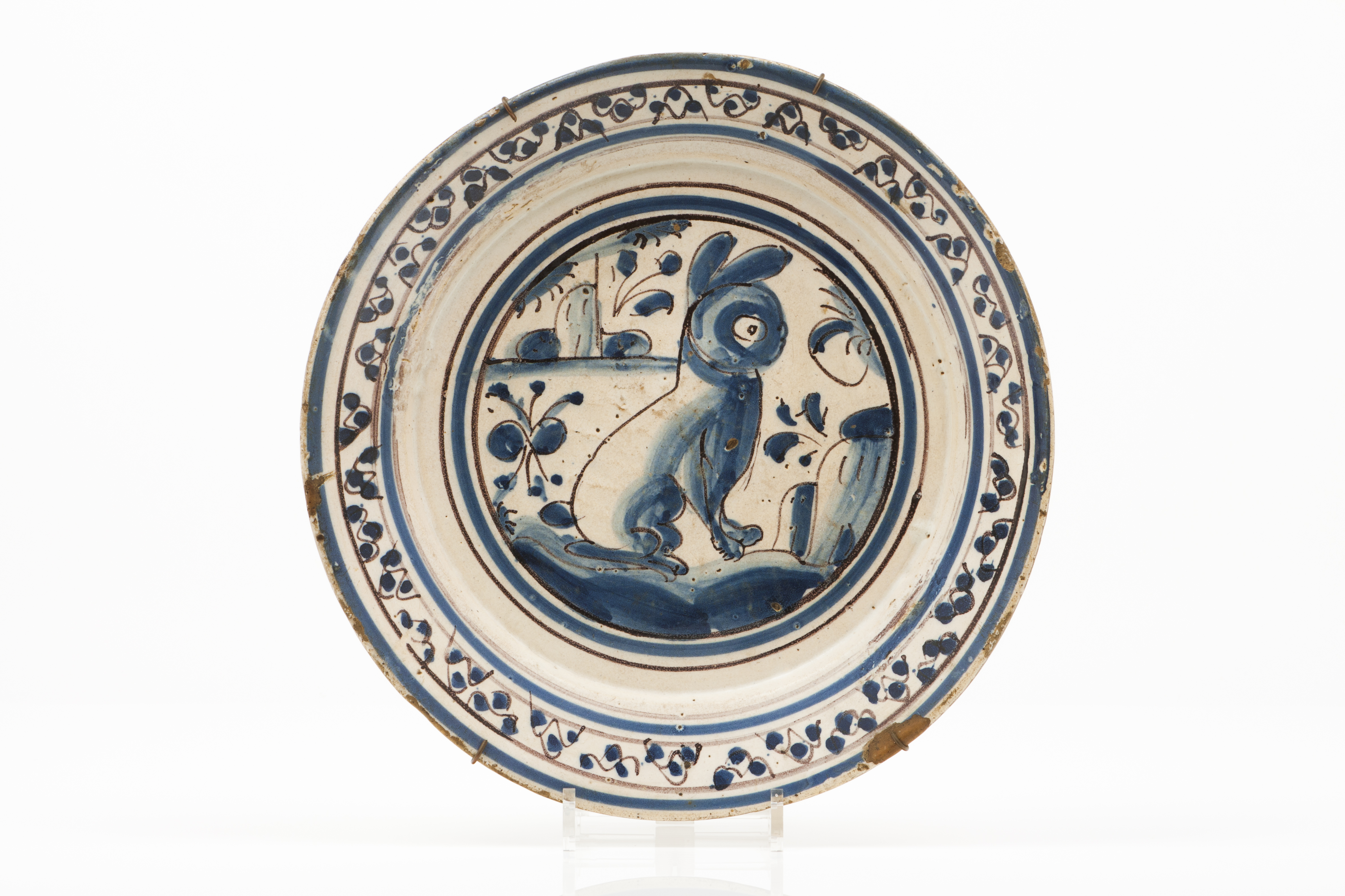 Decoração a azul cobalto e vinoso representando ao centro coelho e aba com faixa de contas