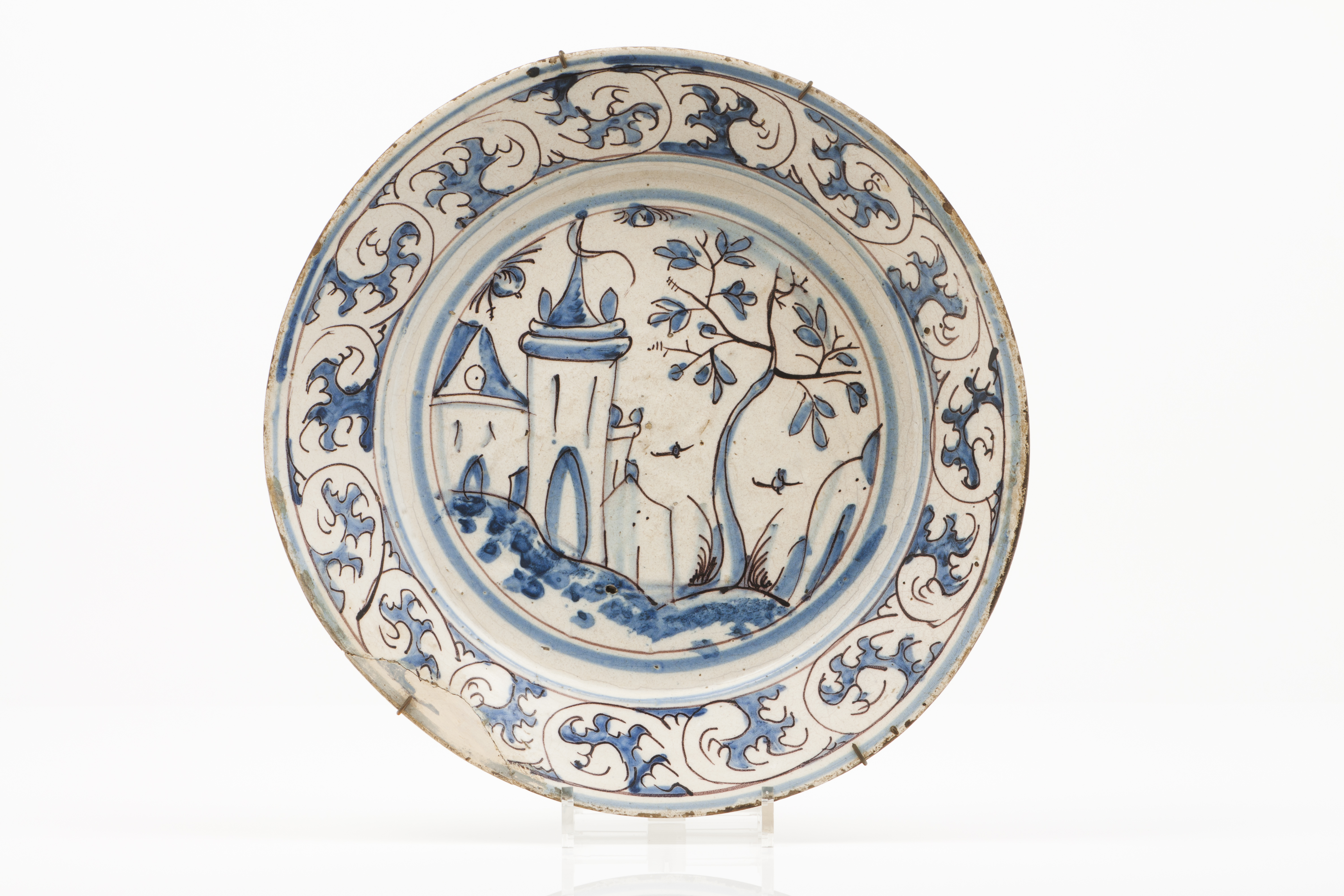 Decoração a azul cobalto e vinoso de manganés representando ao centro paisagem com casario e aba com faixa barroca
