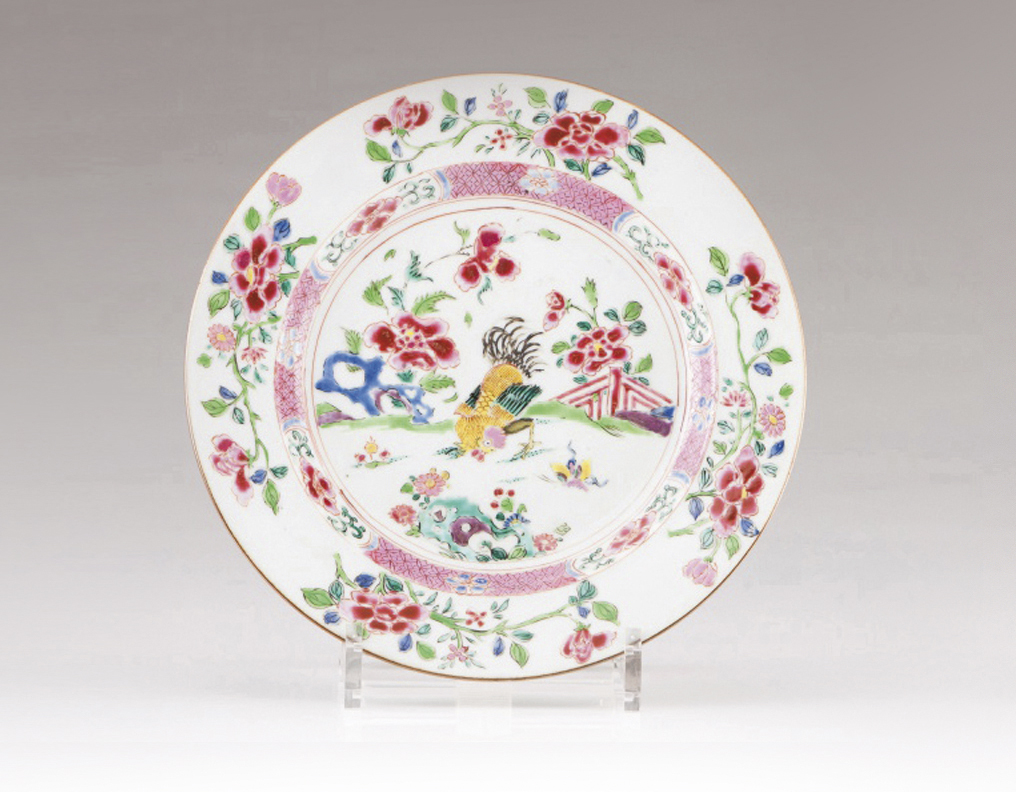 Decoração policromada com esmaltes da Família Rosa representando galo observando borboleta num jardim