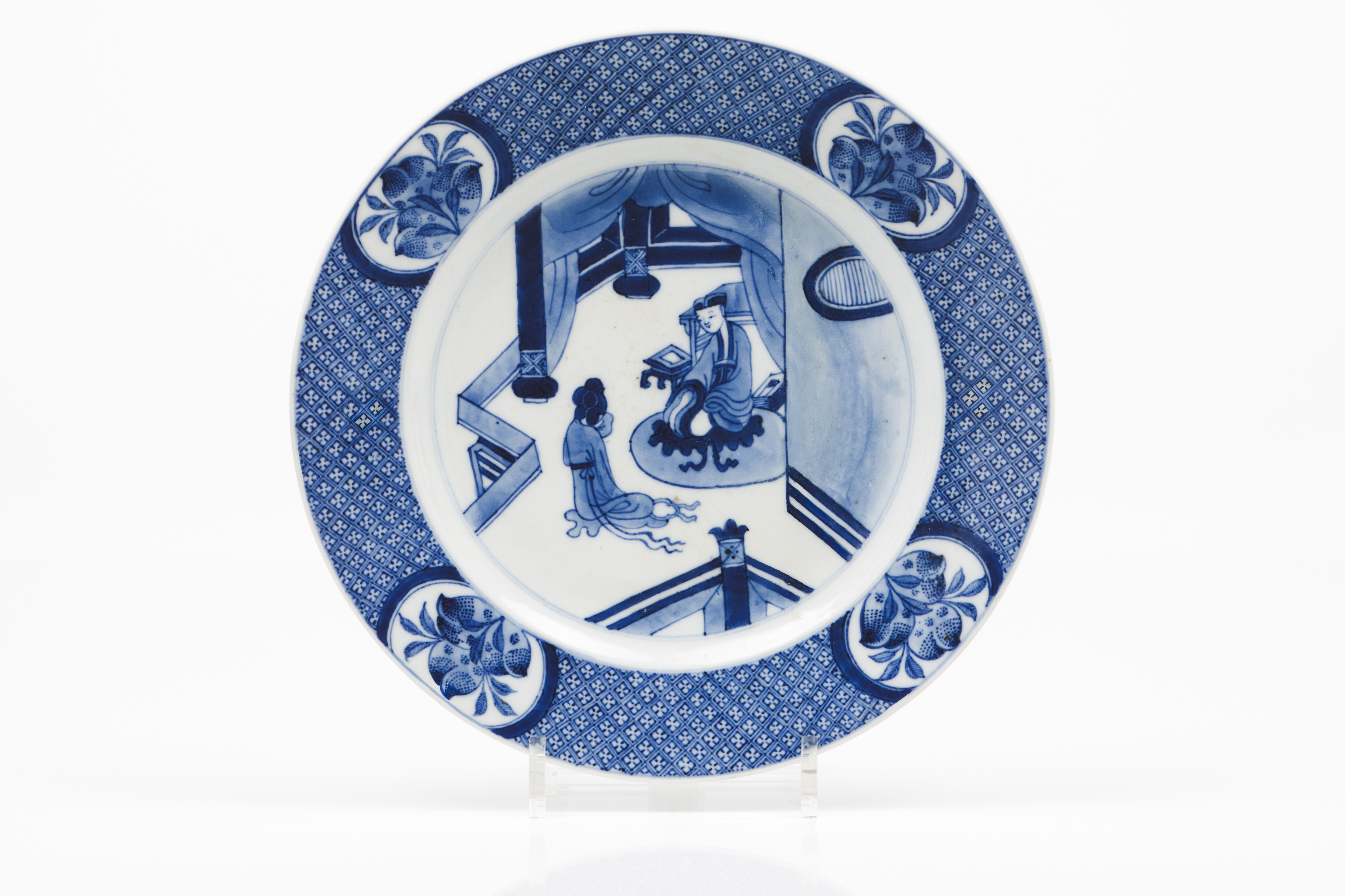 Decoração a azul sob vidrado representando ao centro vista de interior com figuras
