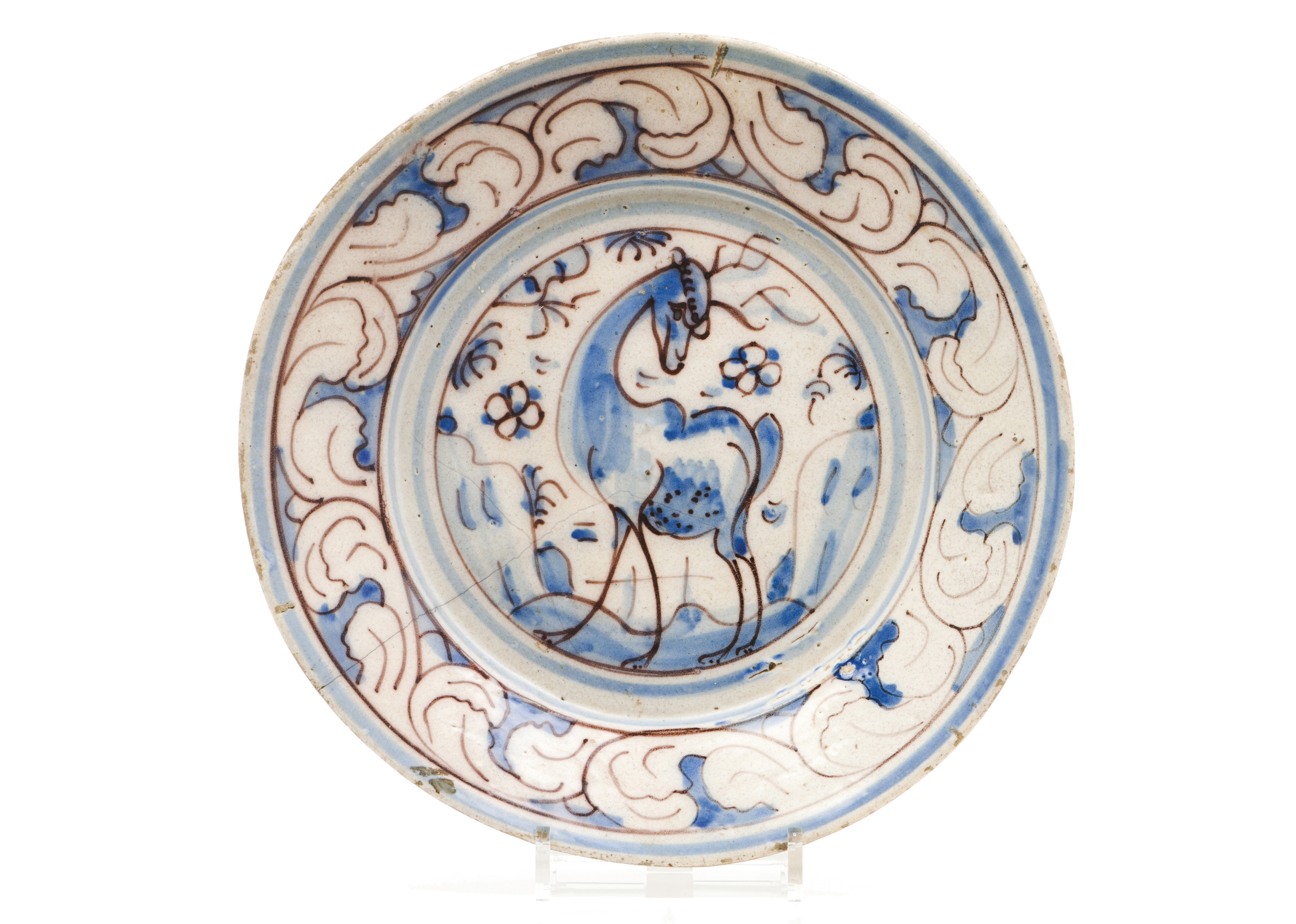 Decoração a azul cobalto e vinoso de manganés representando paisagem com veado