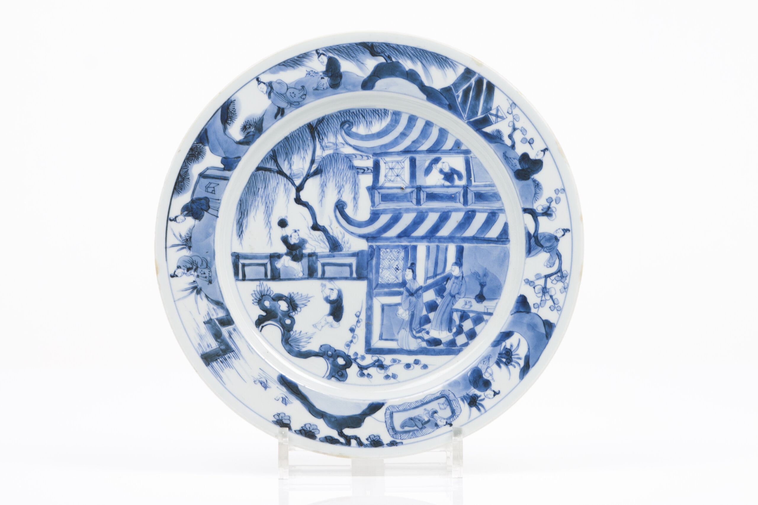 Decoração a azul sob vidrado representando vista de jardim com figuras orientais
