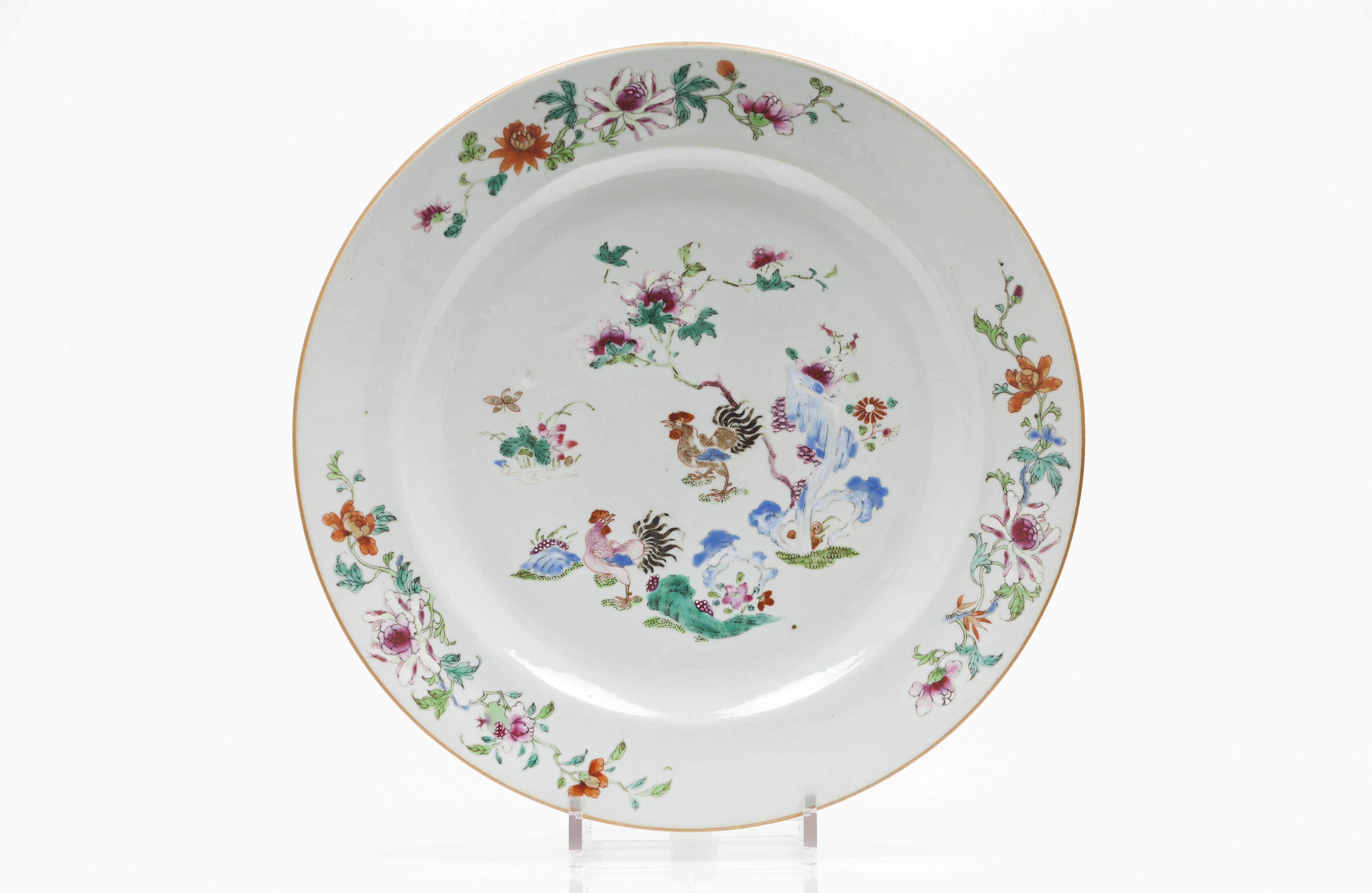 Decoração policromada com esmaltes da Família Rosa representando paisagem com flores, rochedo e galos