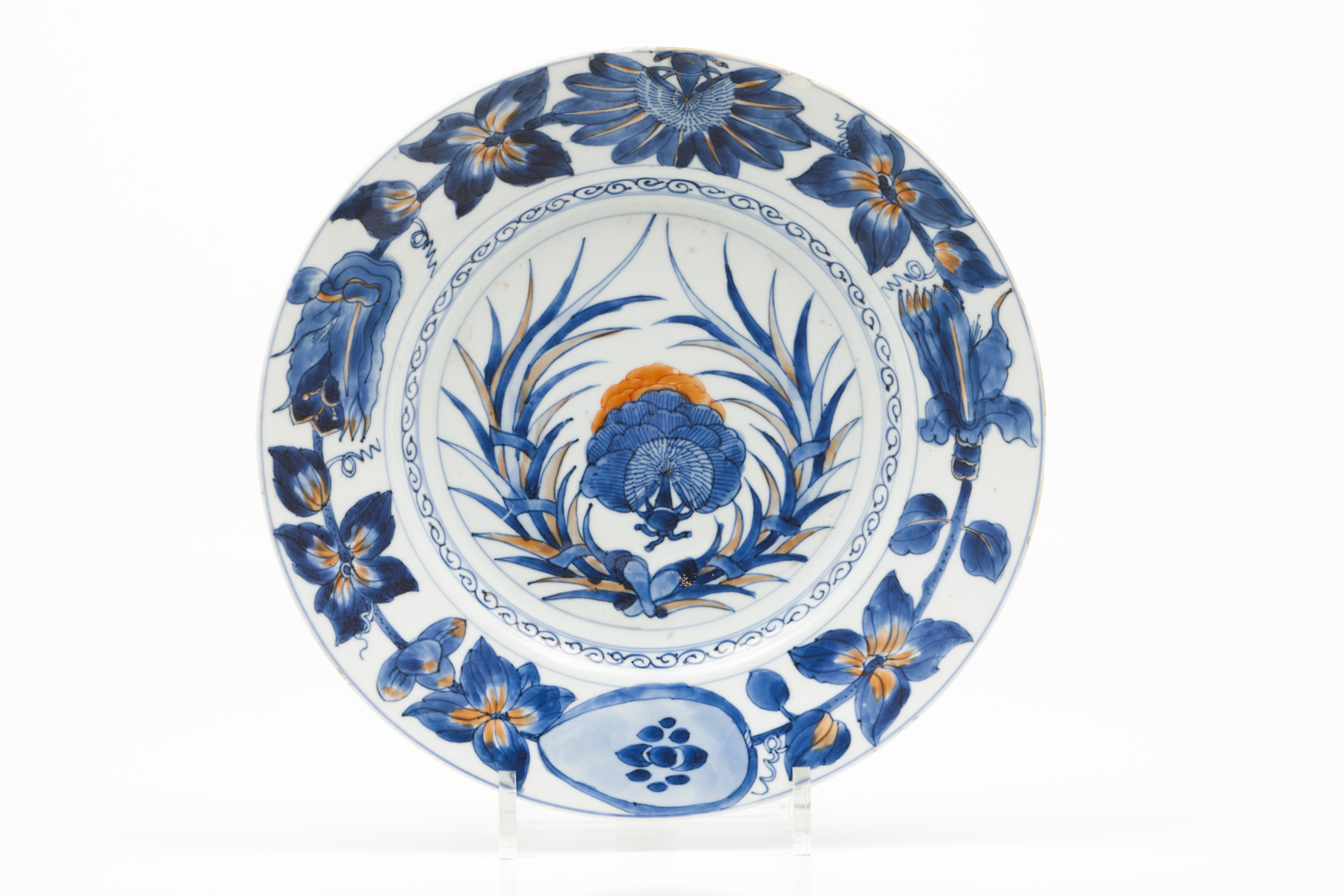Decoração a azul sob vidrado e rouge-de-fer representando motivos florais