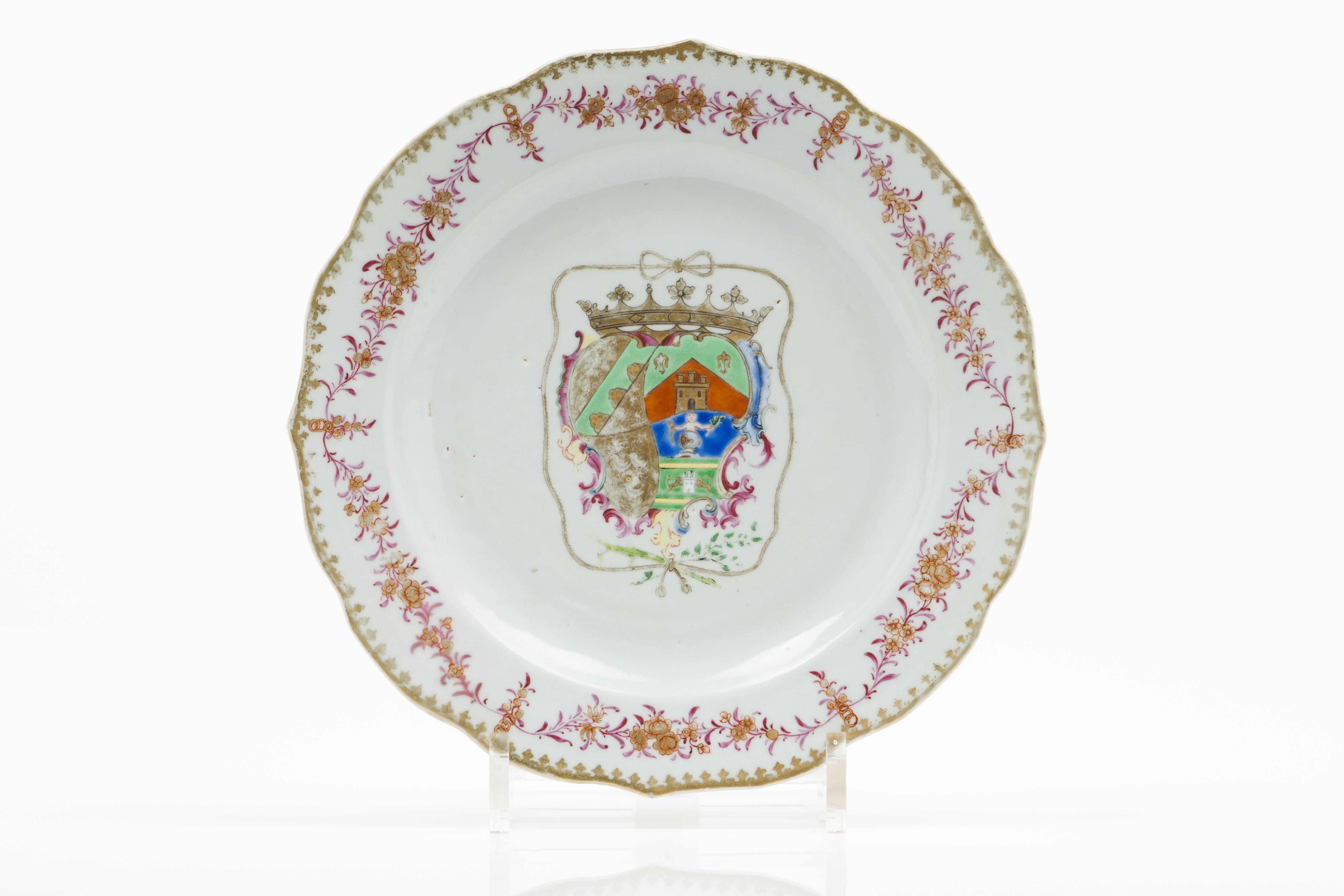 Decoração policromada com esmaltes da Família Rosa representando armas de Juana Antonia Bucareli y Baeza, quarta marquesa de Vallehermoso, Grande de Espanha