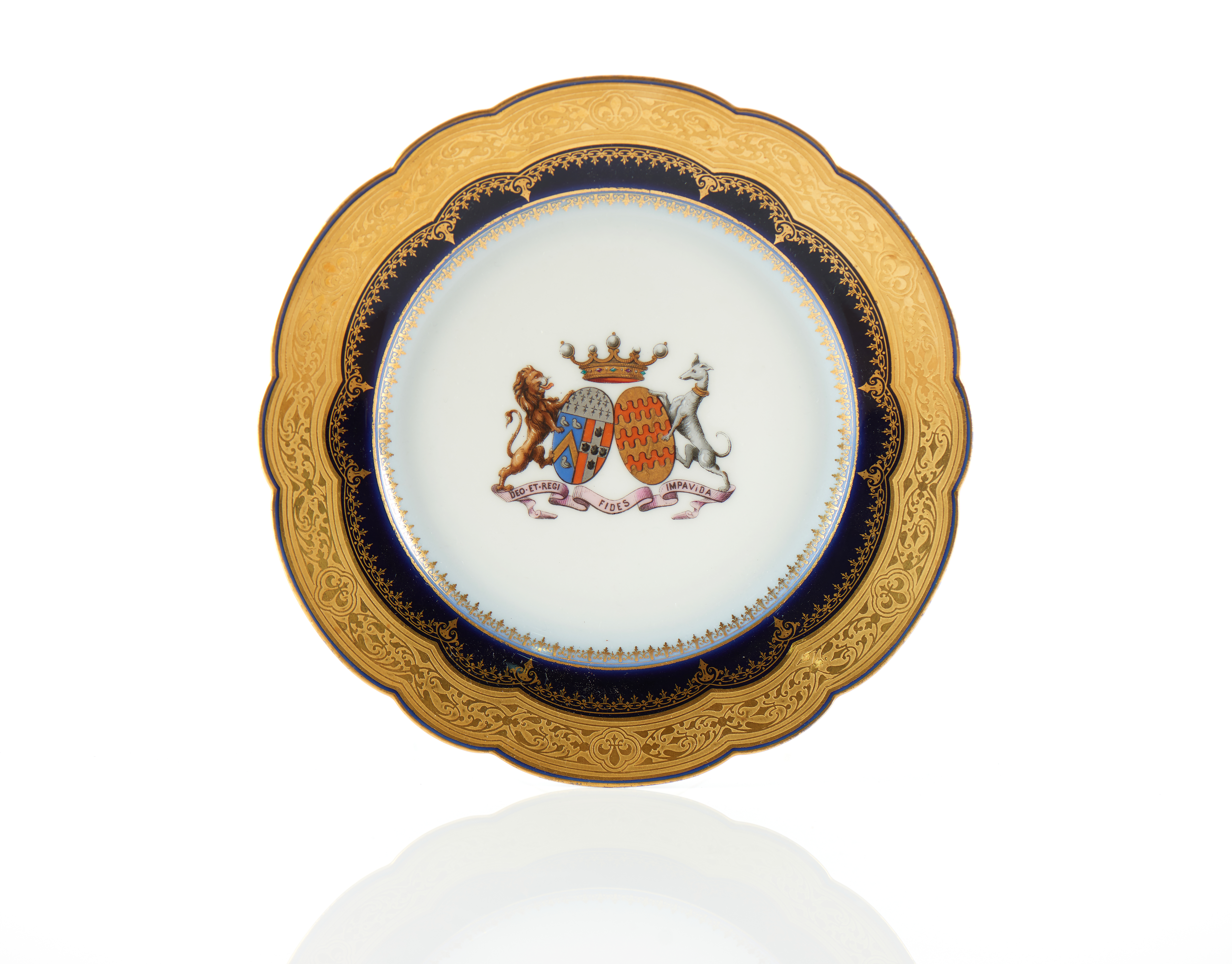 Prato em porcelana de bordo polilobado com aba de fundo azul com friso de ouro brunido ornado de friso de enrolamentos de flores-de-lis em cartelas, a caldeira ornada por friso entrelaçado de flores-de-lis com escudo heráldico de casamento da família Hutteau d'Origny suportados por leão e lebre cobre divisa "DEO ET REGI FIDES IMPAVIDA" sob coroa de visconde