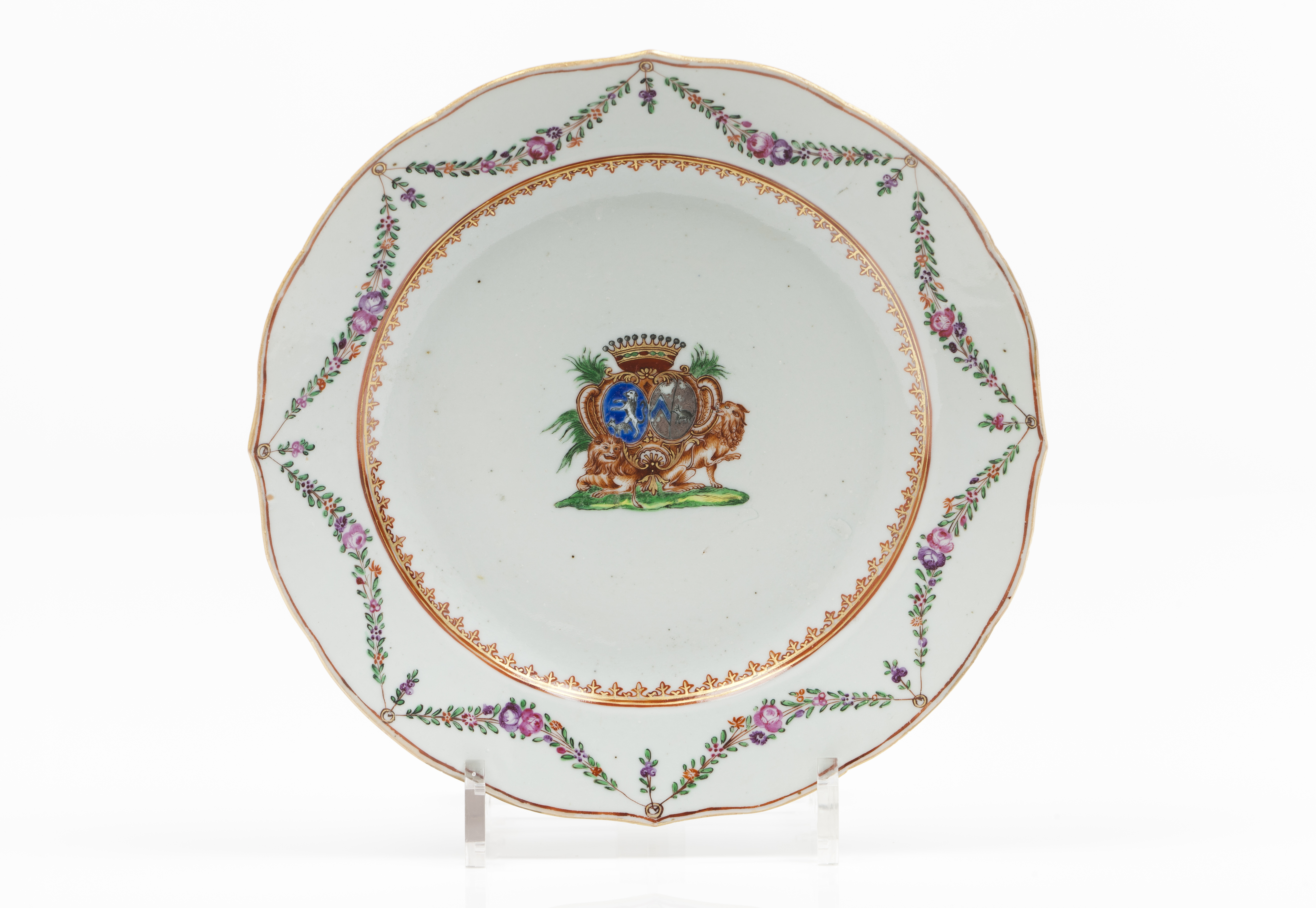 Com aba recortada e decoração policromada com esmaltes da Família Rosa representando ao centro armas de família europeia