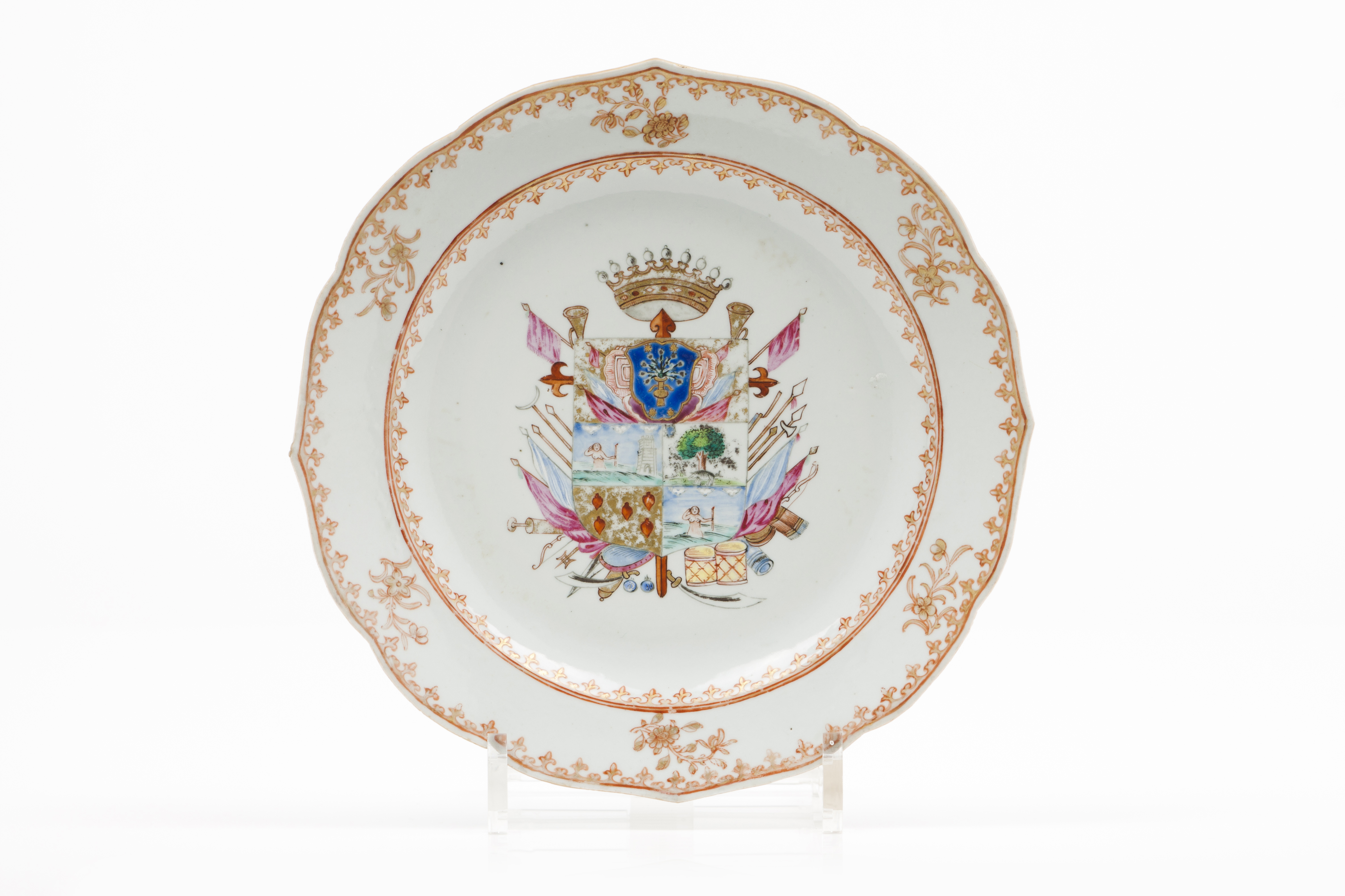 Decoração policromada com esmaltes da Família Rosa com flores e armas de Juan Bautista de Uztáriz y Gastelu, 1º conde de Reparaz