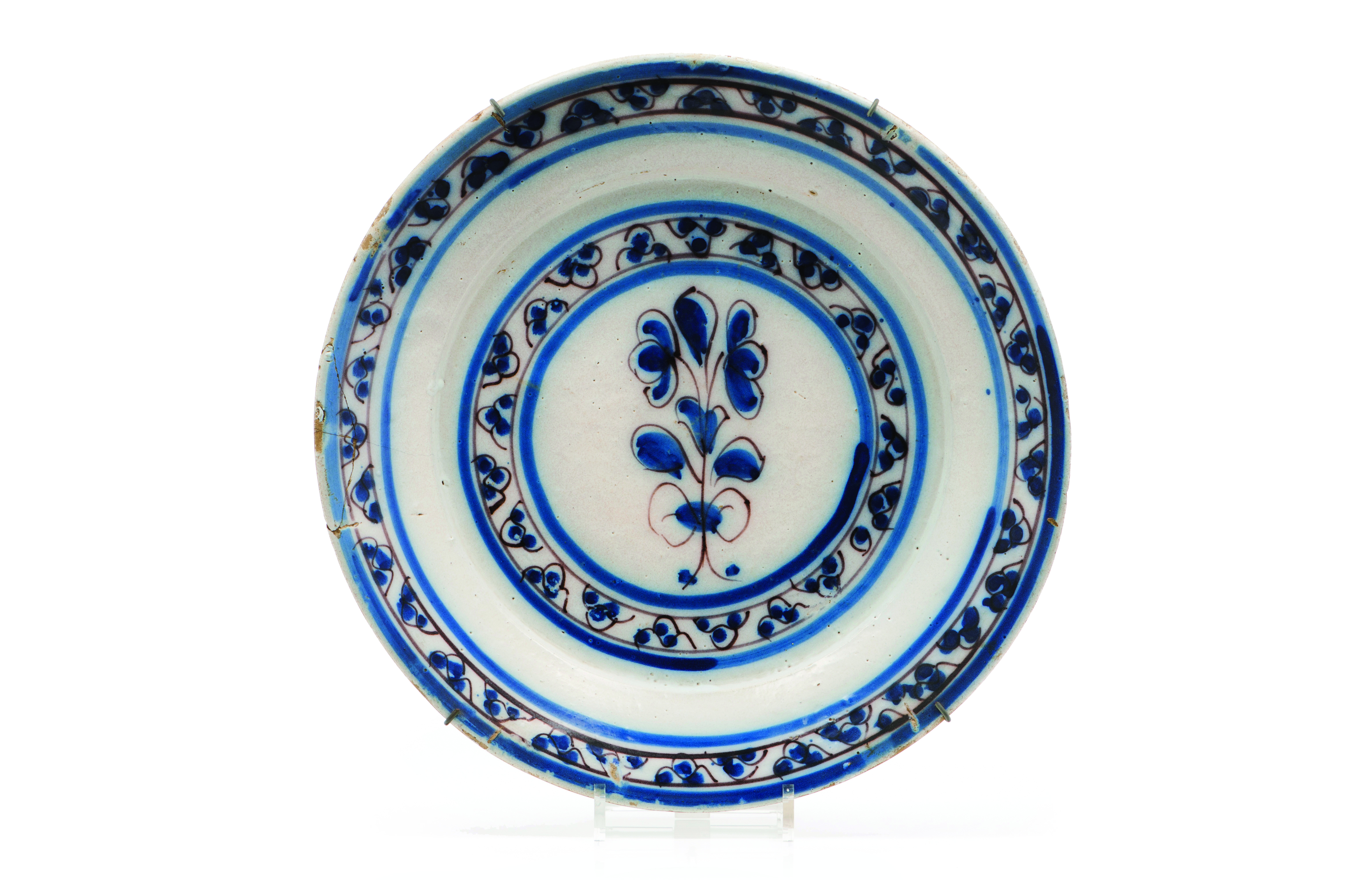 Decoração a azul cobalto e vinoso representando flor ao centro, com duas cercaduras de "contas"