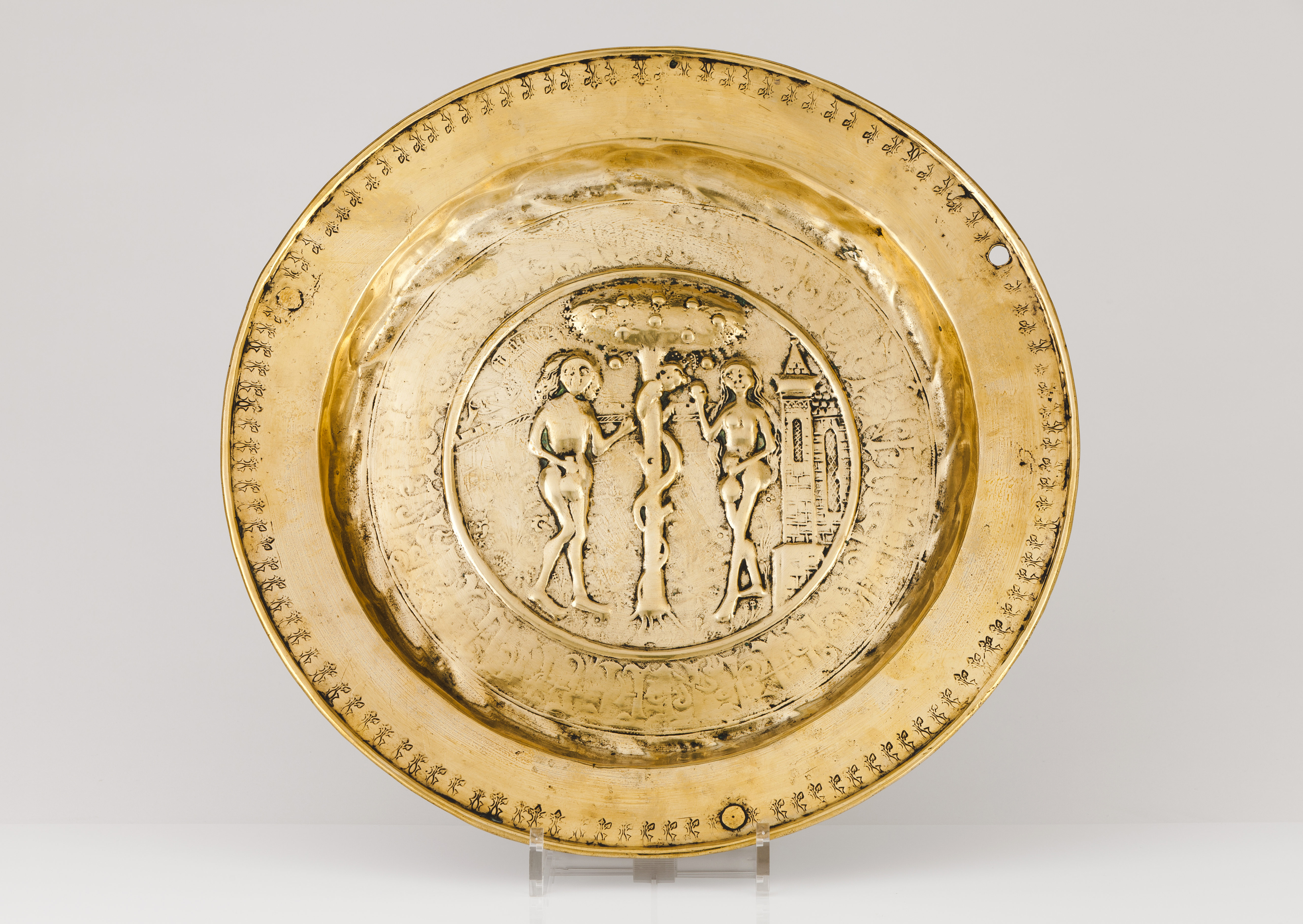 Decoração relevada representando, ao centro, Adão e Eva, circunscrito por tarja de caracteres góticos