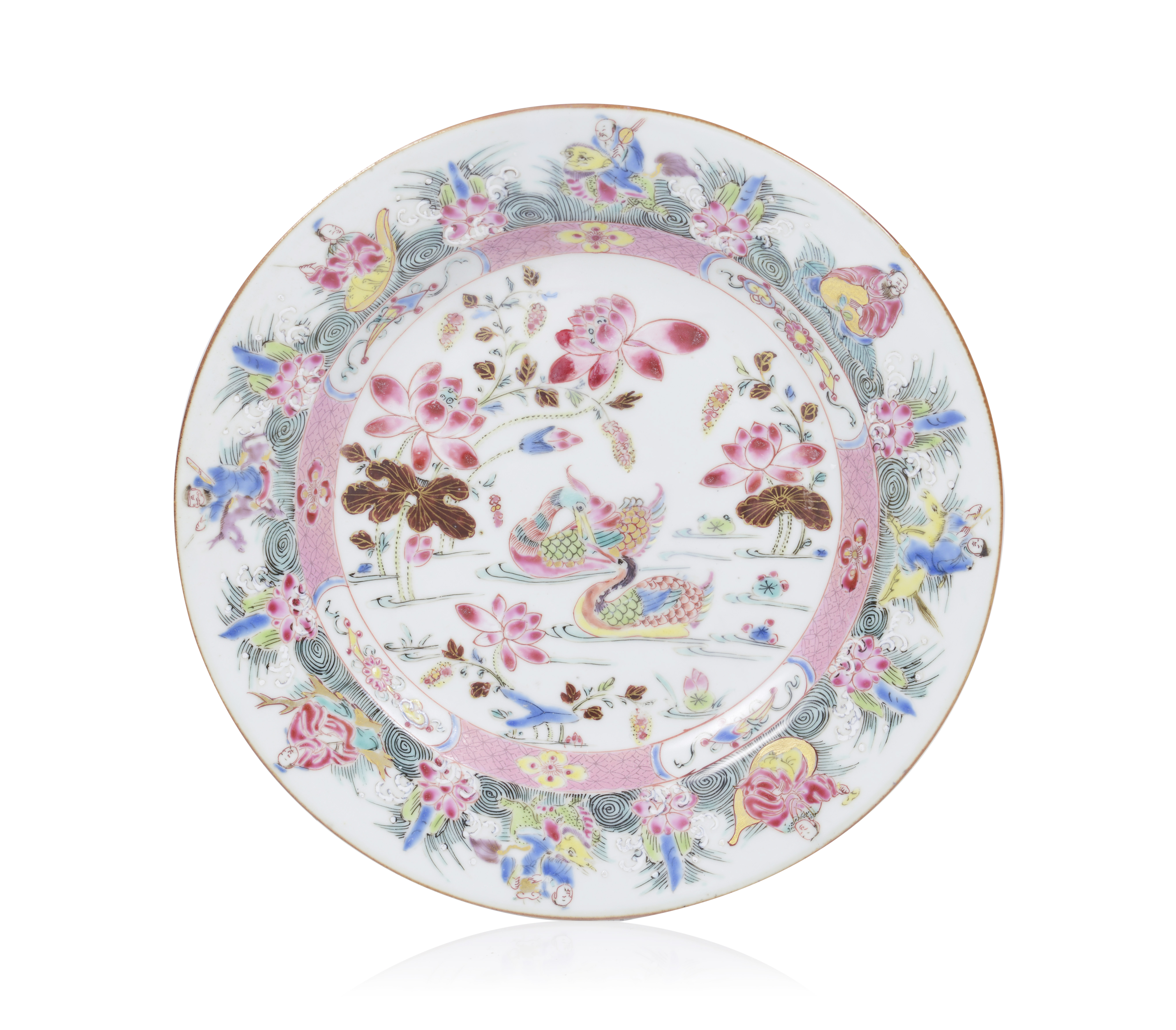 Decorado com esmaltes da Família Rosa representando ao centro uma vista de lago com plantas aquáticas e um casal de patos mandarim