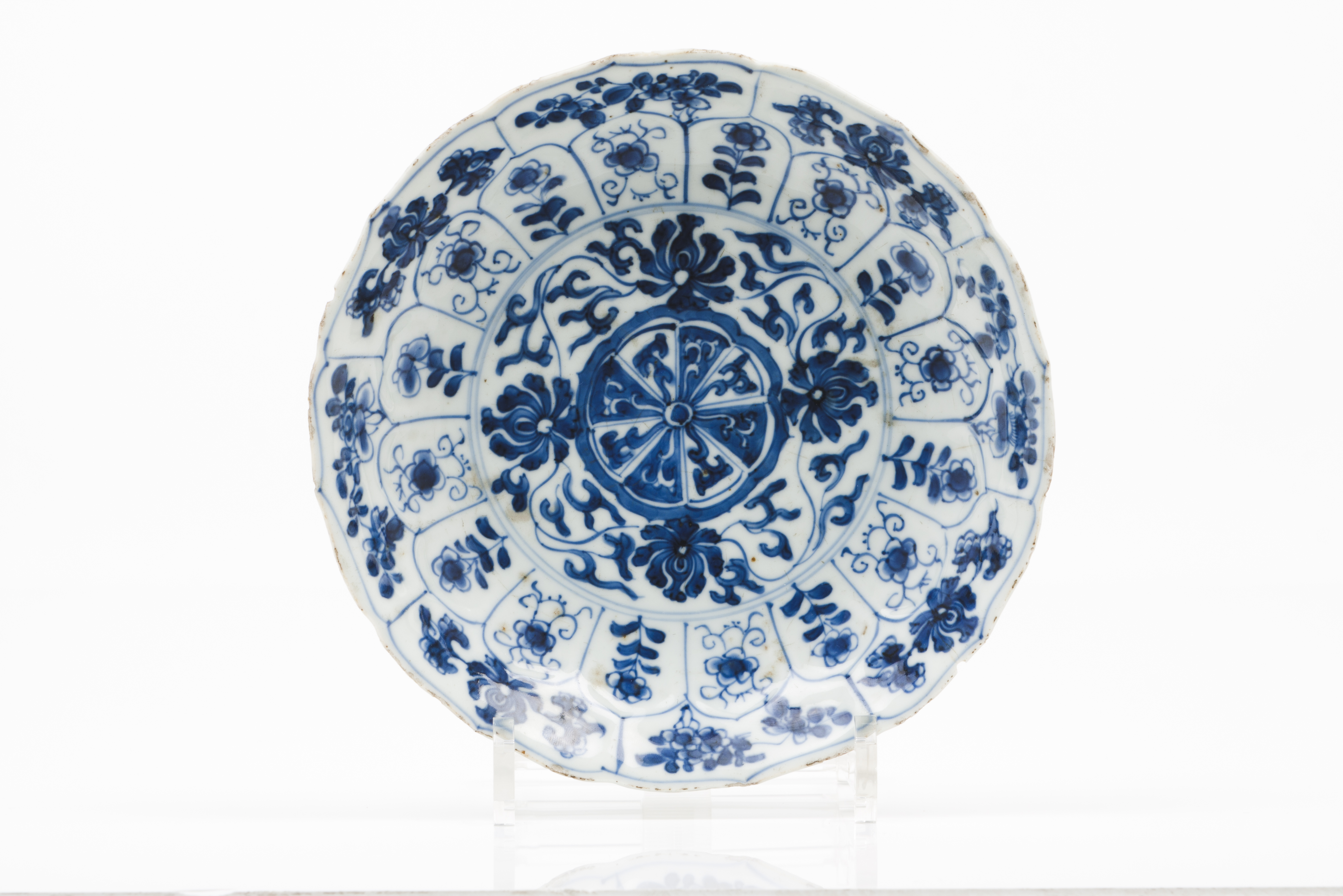 Decoração moldada e pintada a azul sob vidrado representando painéis em forma de pétalas e motivos florais