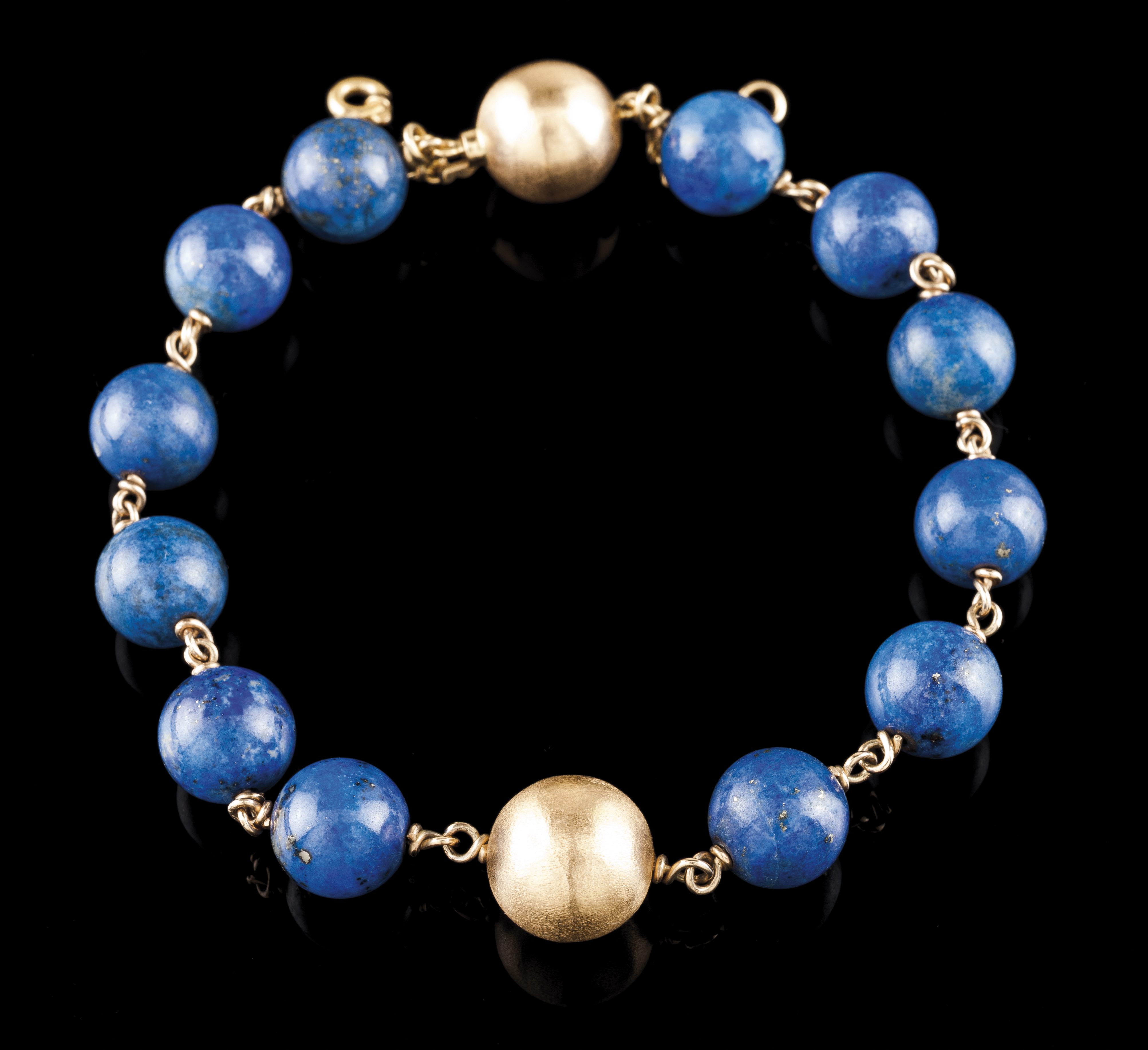 Em ouro com contas de lapis-lazuli e duas contas em ouro escovado