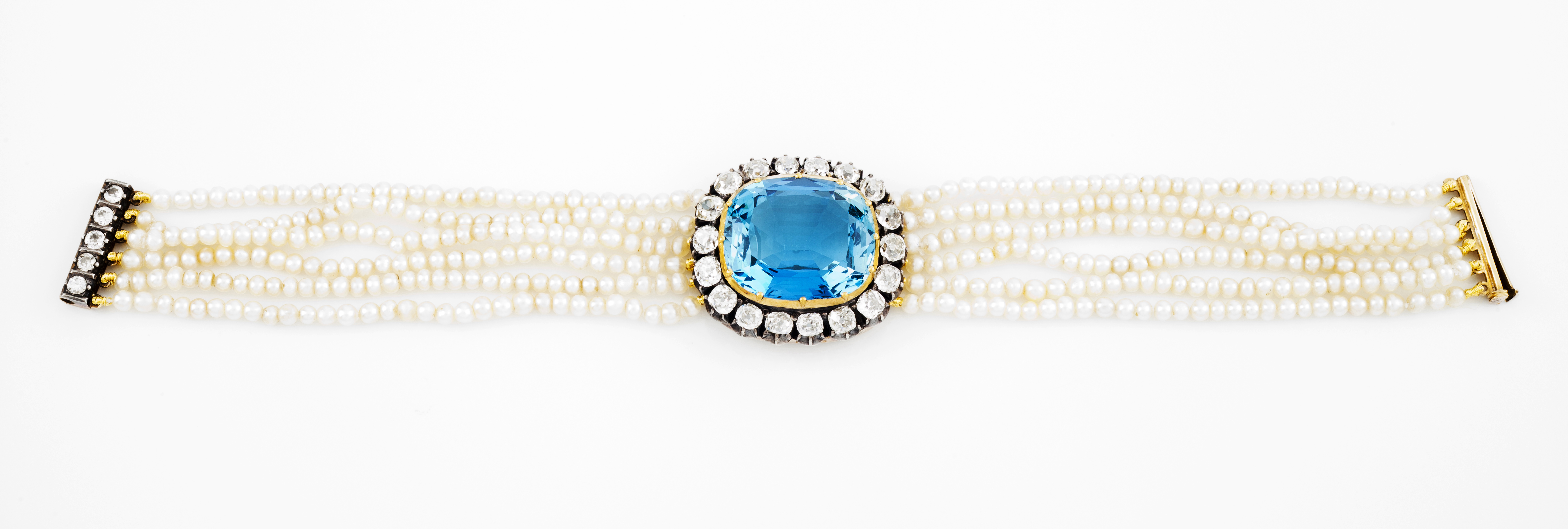 Composta por 6 fiadas de pérolas de cultura (ca. 2,5 mm) com fecho em prata e ouro cravejado com 5 diamantes em talhe antigo de brilhante com total (ca. 0.30ct) tendo ao centro um elemento cravejado com uma água marinha (ca. 17.20ct) emoldurada por friso com 18 diamantes em talhe antigo de brilhante, total(ca. 2.10ct)
