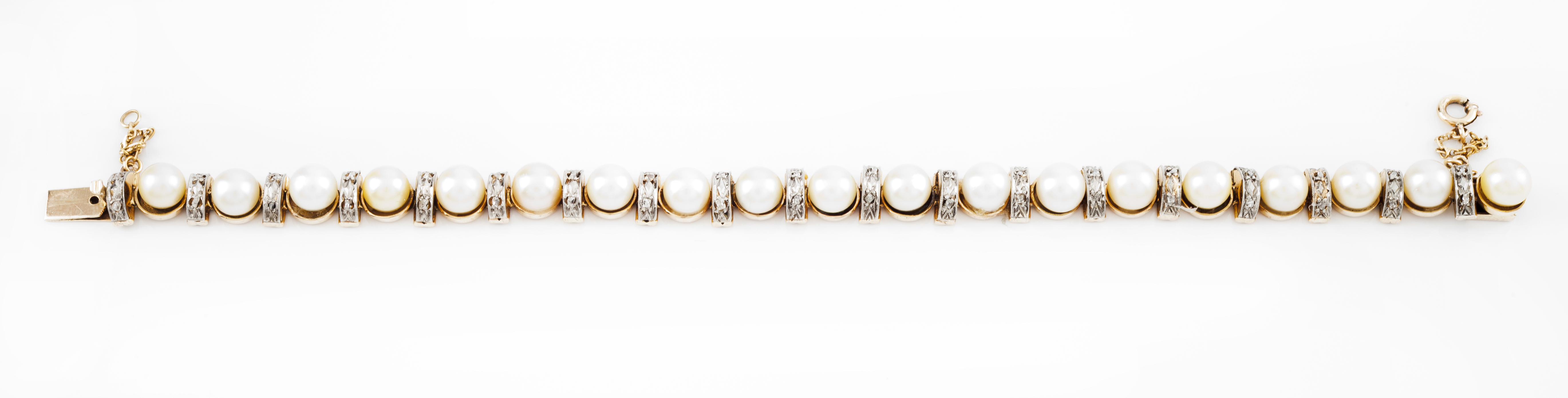 Elos articulados cravejados com pérolas de cultura (ca. 6 mm intercalados por elementos em prata cravejados com diamantes em talhe rosa