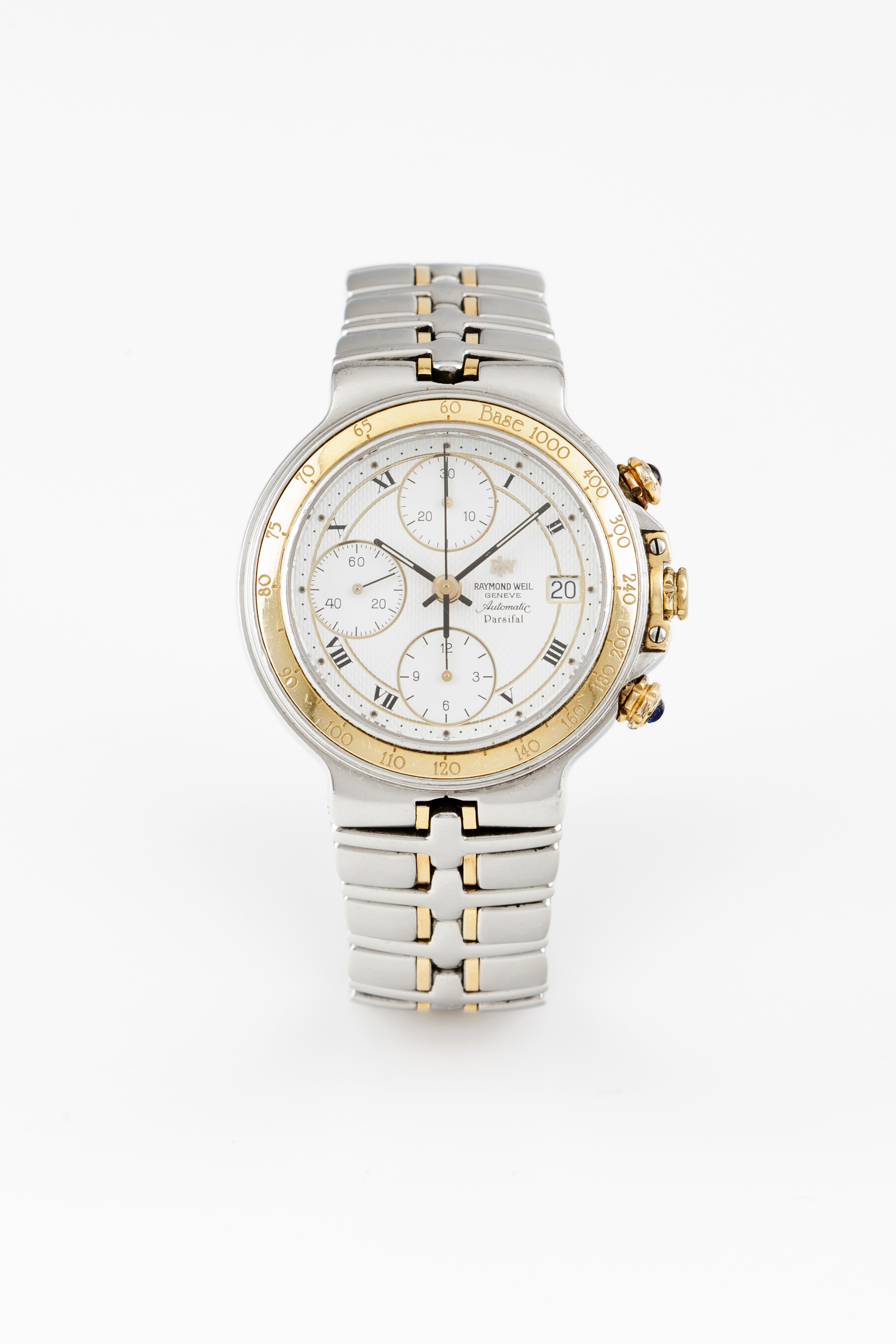 Relógio marca Raimond Weil modelo Parsifal. Movimento mecânico automático cronómetro com data às 3h. Caixa em aço e ouro. Razoável estado de conservação.