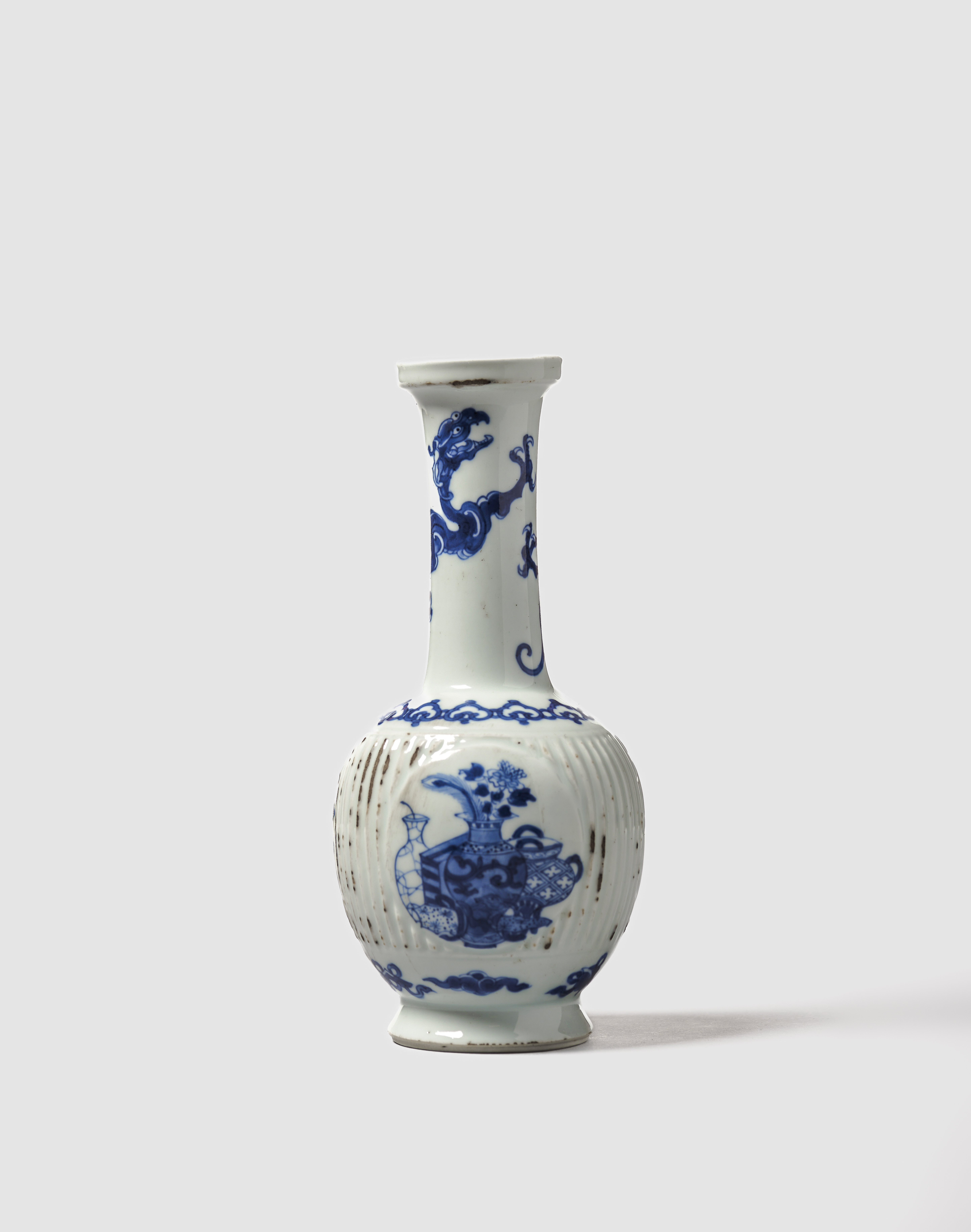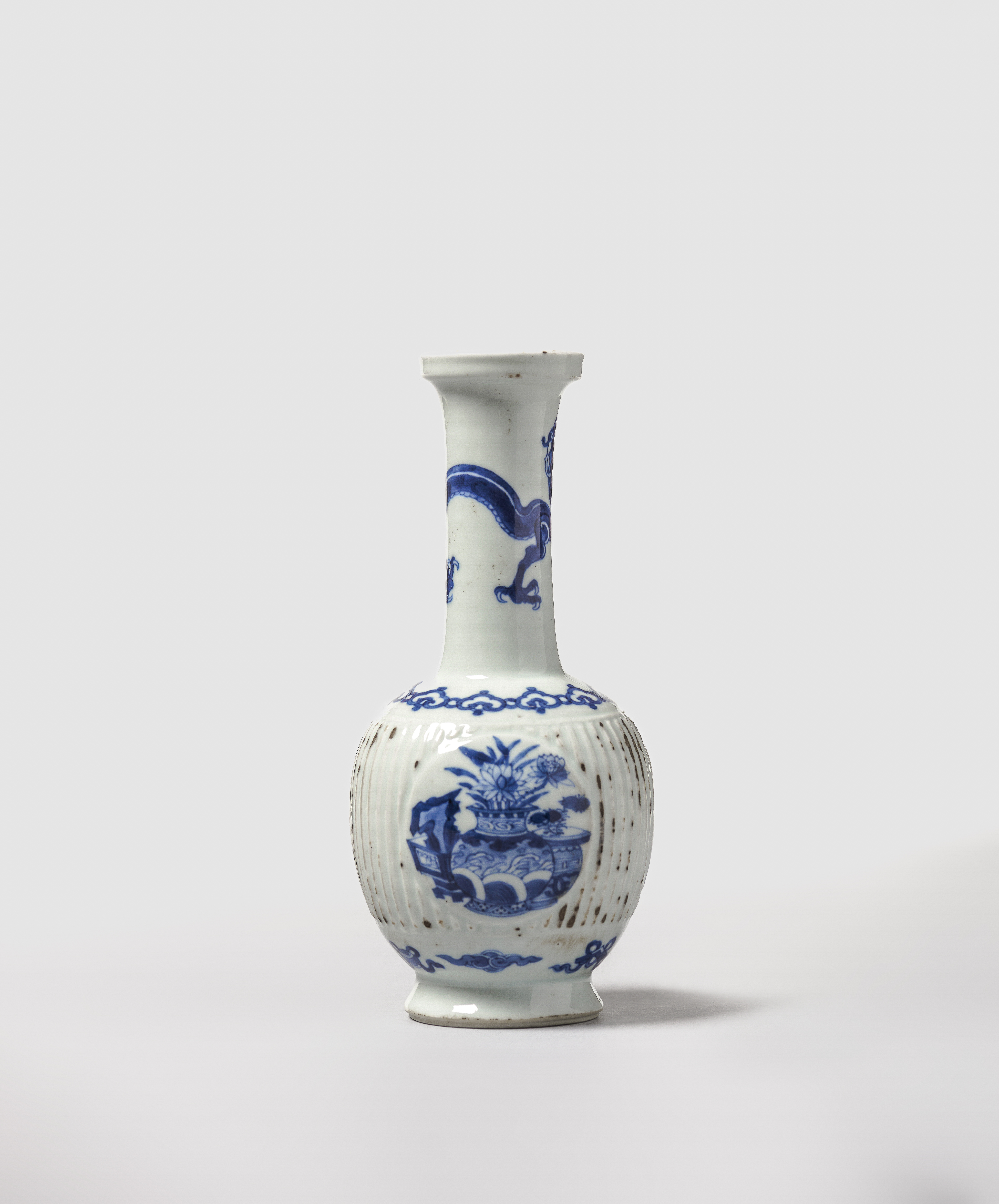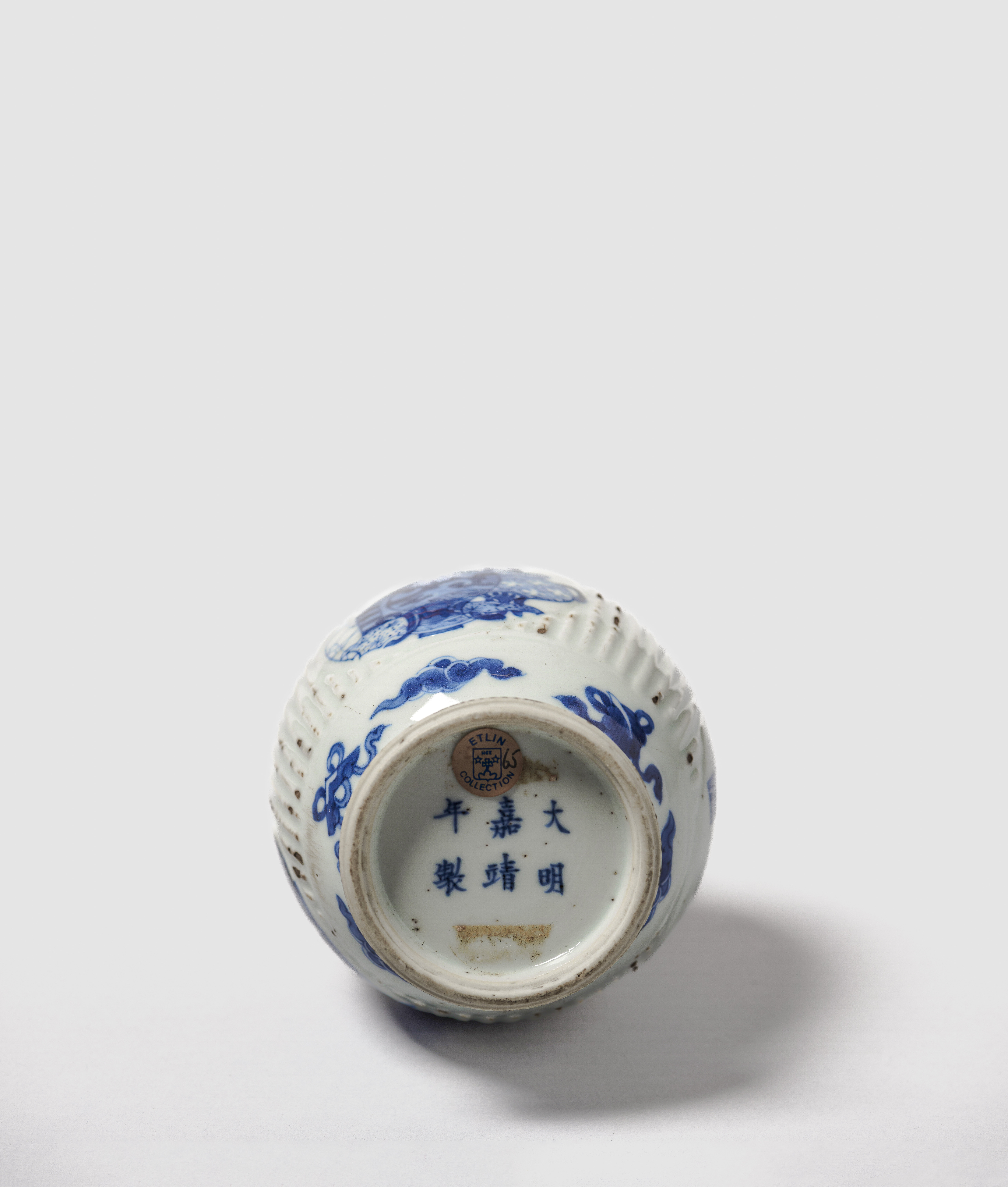 Decorado junto ao pé com três emblemas auspiciosos, com cercadura de lingzhi no ombro e chilong em torno do pecoço (falhas de vidrado)