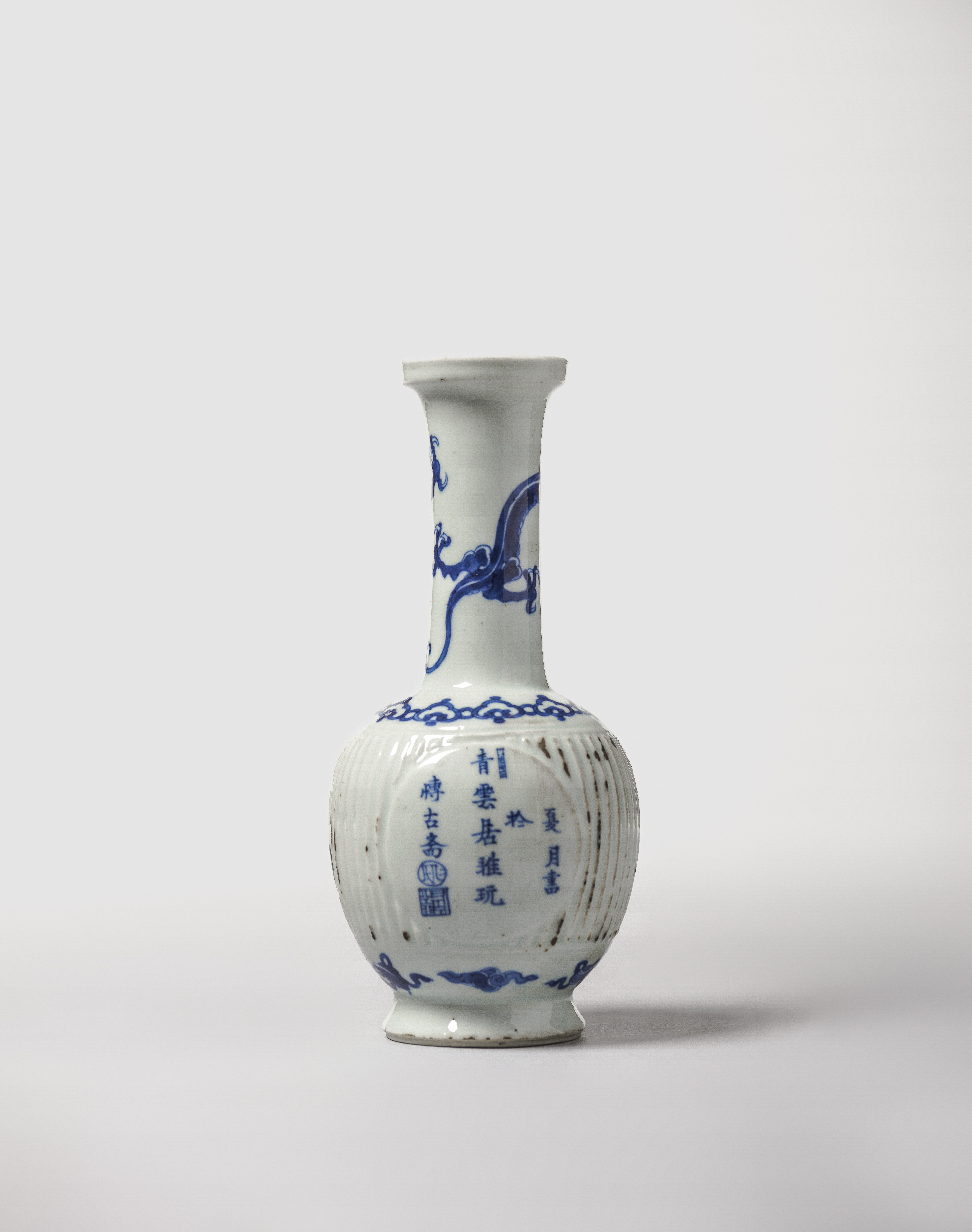 Em porcelana, moldada com um pé curto, corpo globular e pescoço longo e estreito. Decorada no corpo com nervuras verticais e três medalhões pintados a azul cobalto. Dois com composições de vasos com flores e um com inscrição caligráfica e dois selos.