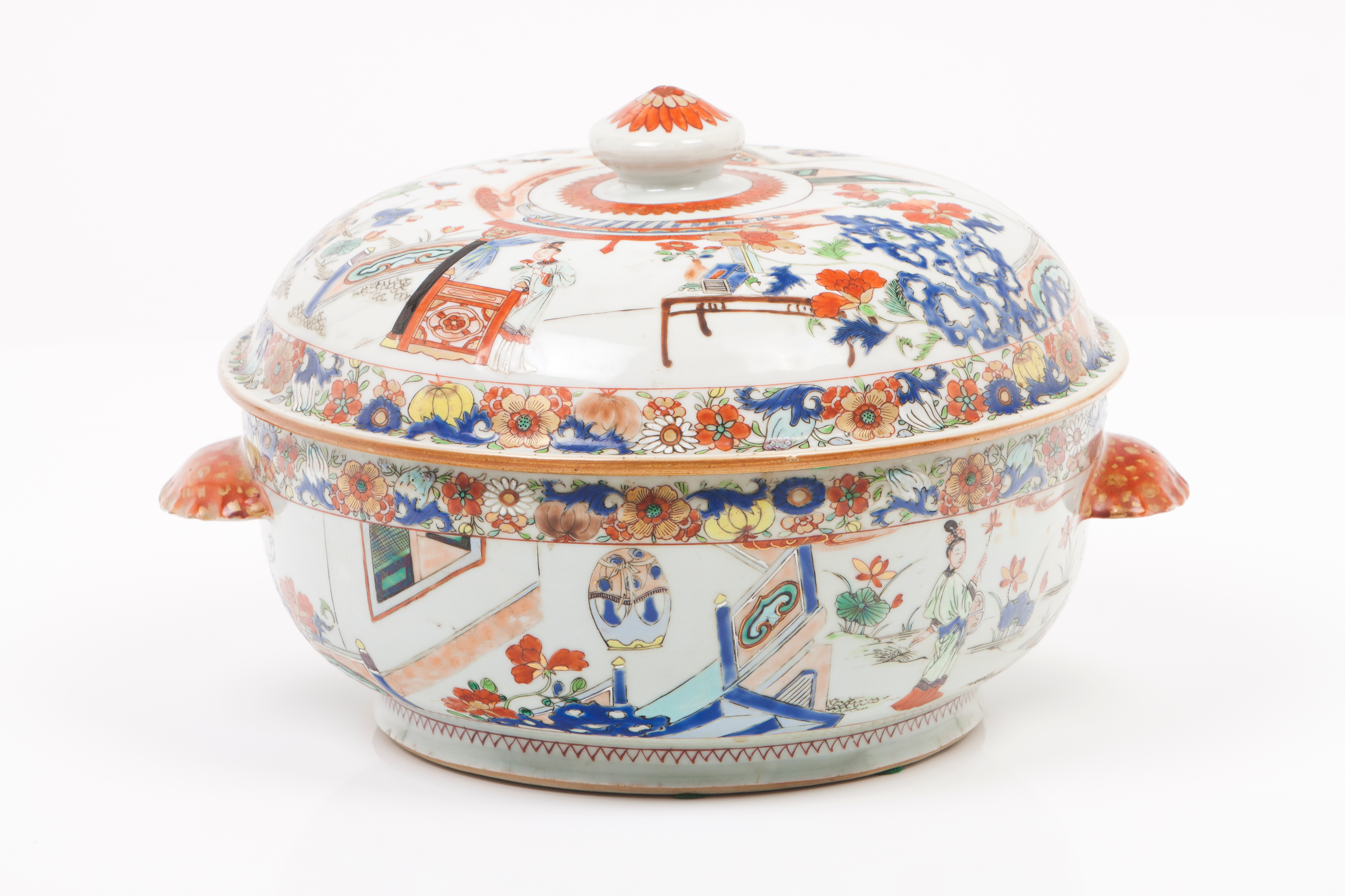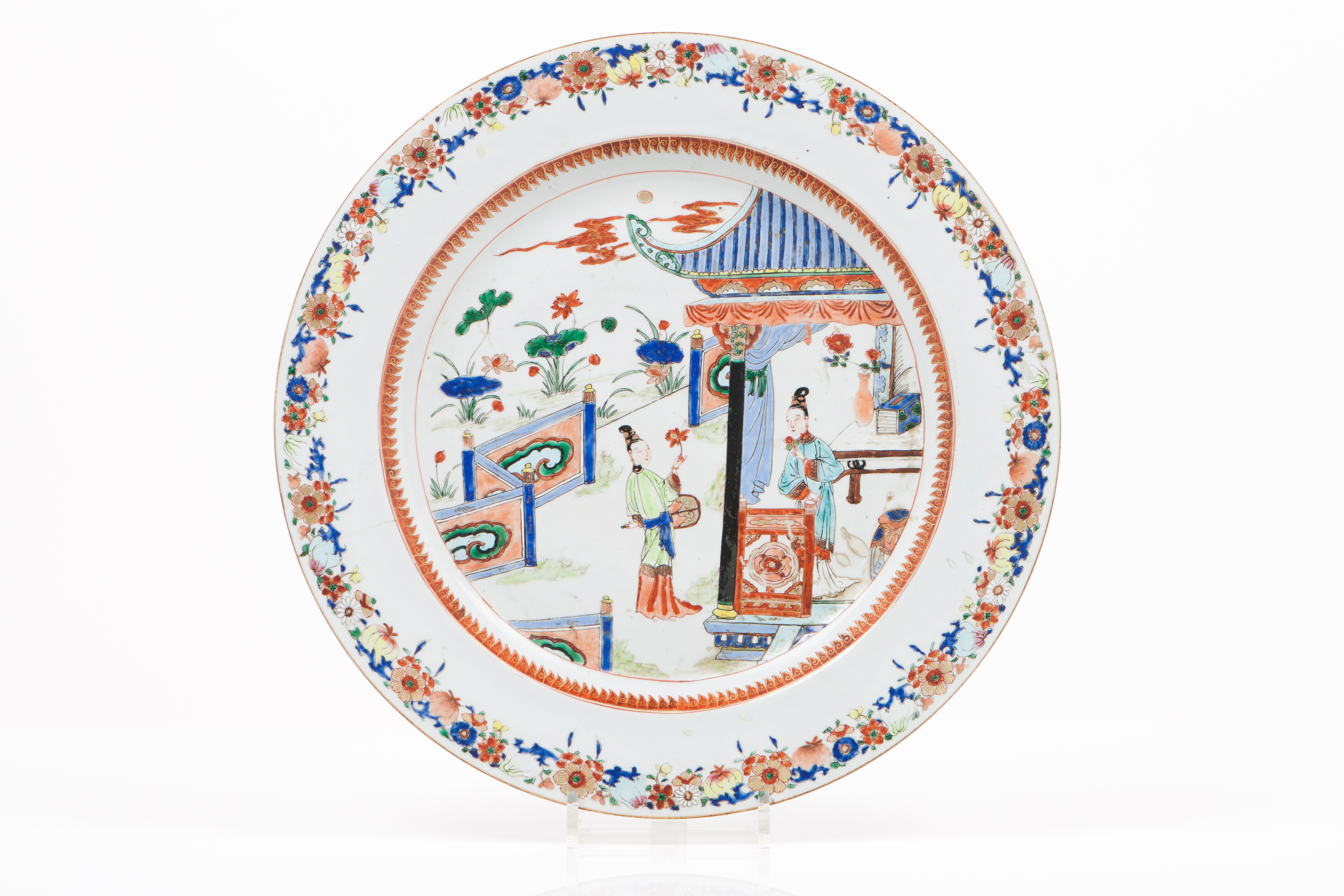 Decoração policromada com esmaltes da Família Rosa representando vista de terraço com duas figuras femininas, uma segurando flores e frutos, incluindo prumos, crisântemos, romãs e cidreira mão de buda