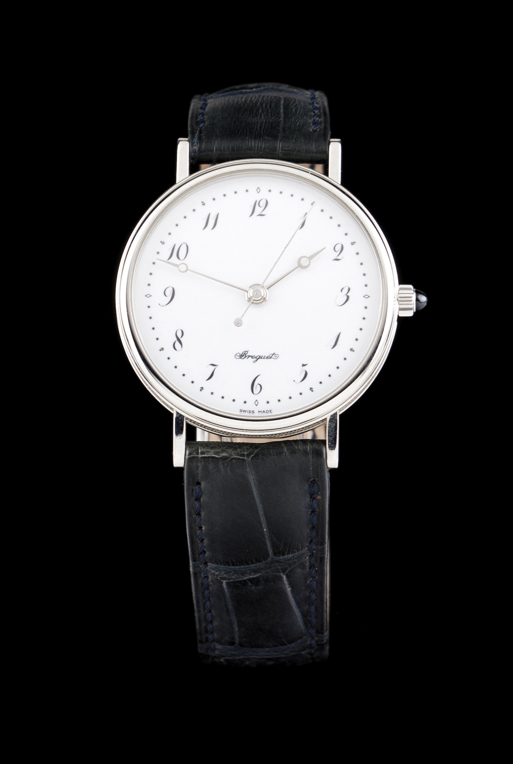 Relógio marca Breguet, Ref.1775. Edição especial limitada a 225 unidades, em platina, comemorativo dos 225 anos da marca Breguet. Movimento mecânico automático de 25 rubis com reserva de marcha para 38h de apenas 7,9mm de espessura. Mostrador de porcelana com numeração Árabe pintada à mão e ponteiros de horas e minutos em ouro branco (750). Coroa em Ouro branco (750) com cabochon em safira. Caixa e fivela original em platina (950). Acompanha estojo e documentação. Em muito bom estado de conservação.