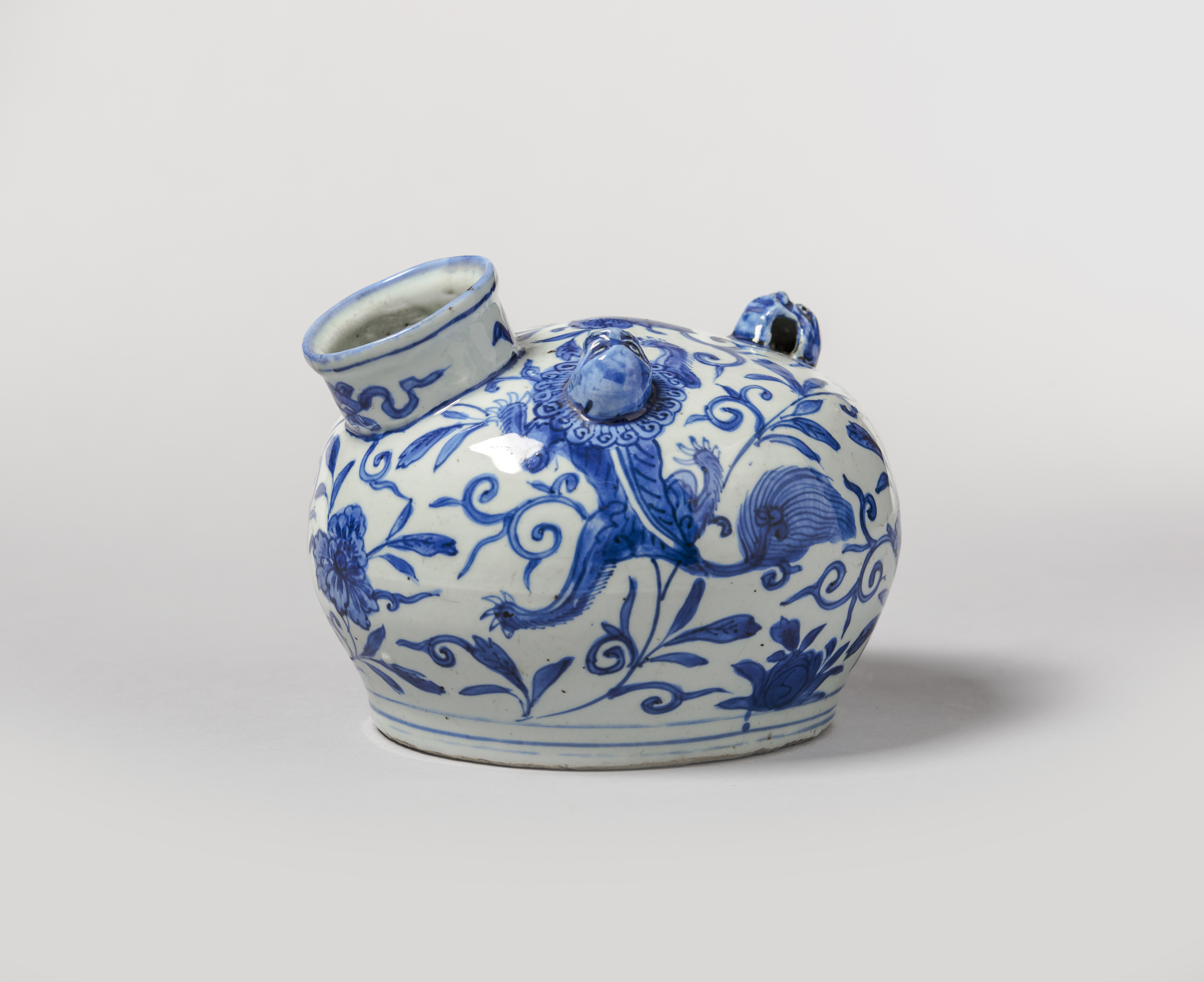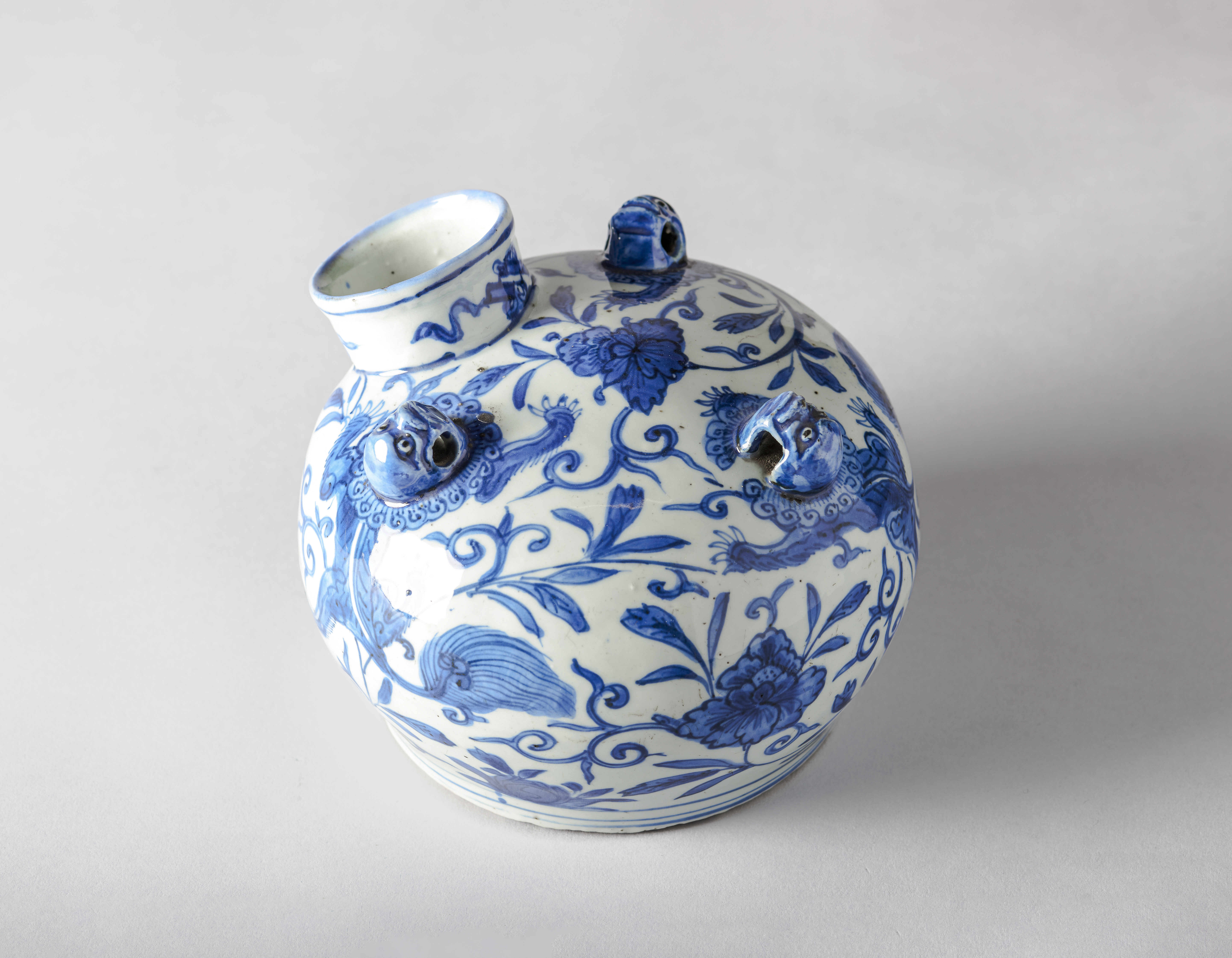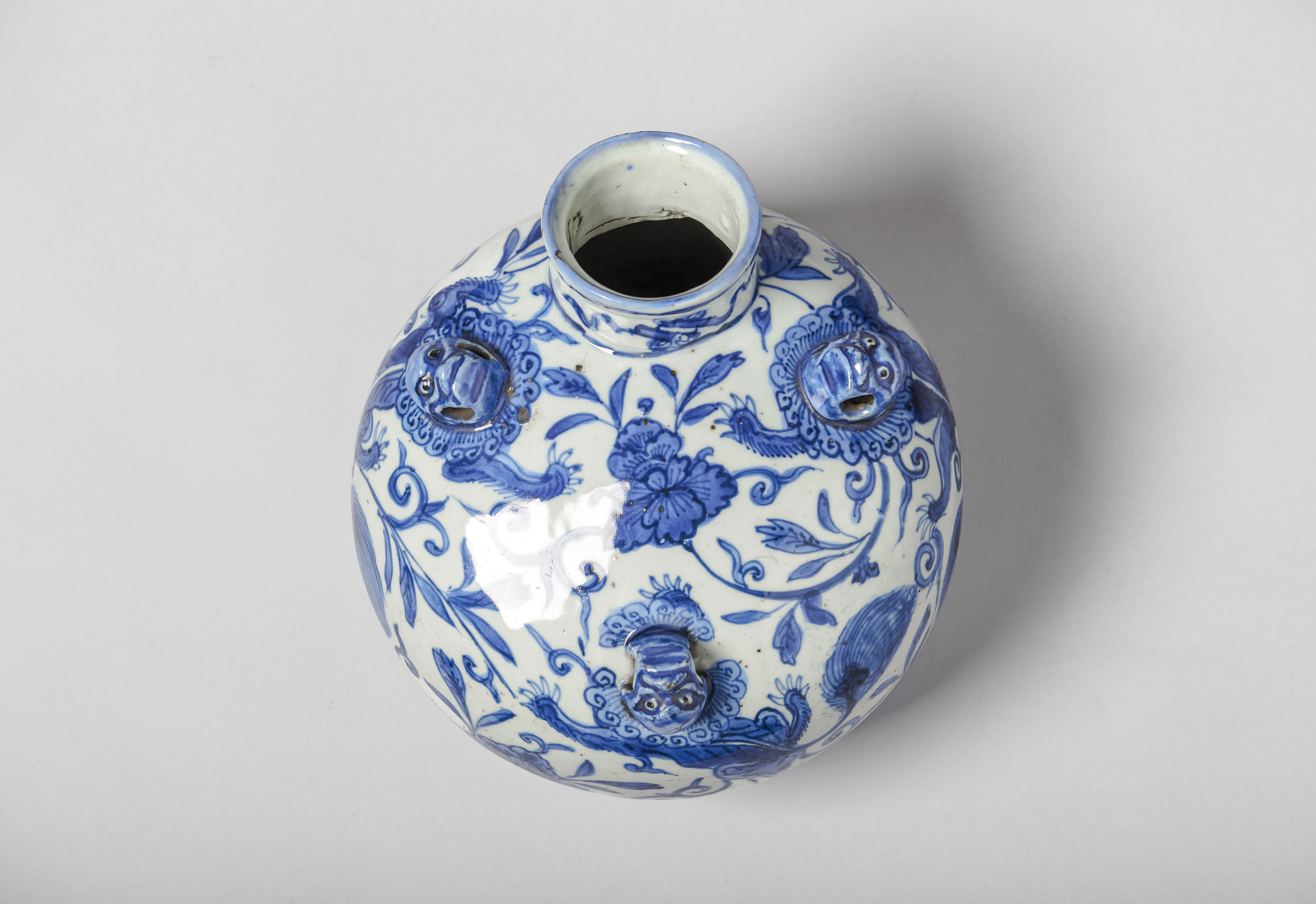 Em porcelana, de formato globular e pintado com tons intensos de azul cobalto. Decorado com três leões rodeados por enrolamentos de peónias e com as cabeças em relevo formando três pegas de argola. Bocal largo, posicionado no ombro, com pescoço curto e cilíndrico, decorado com dois dos 'Oito Objectos Preciosos' (Ba Bao) - o espelho e os rolos de escrita.
