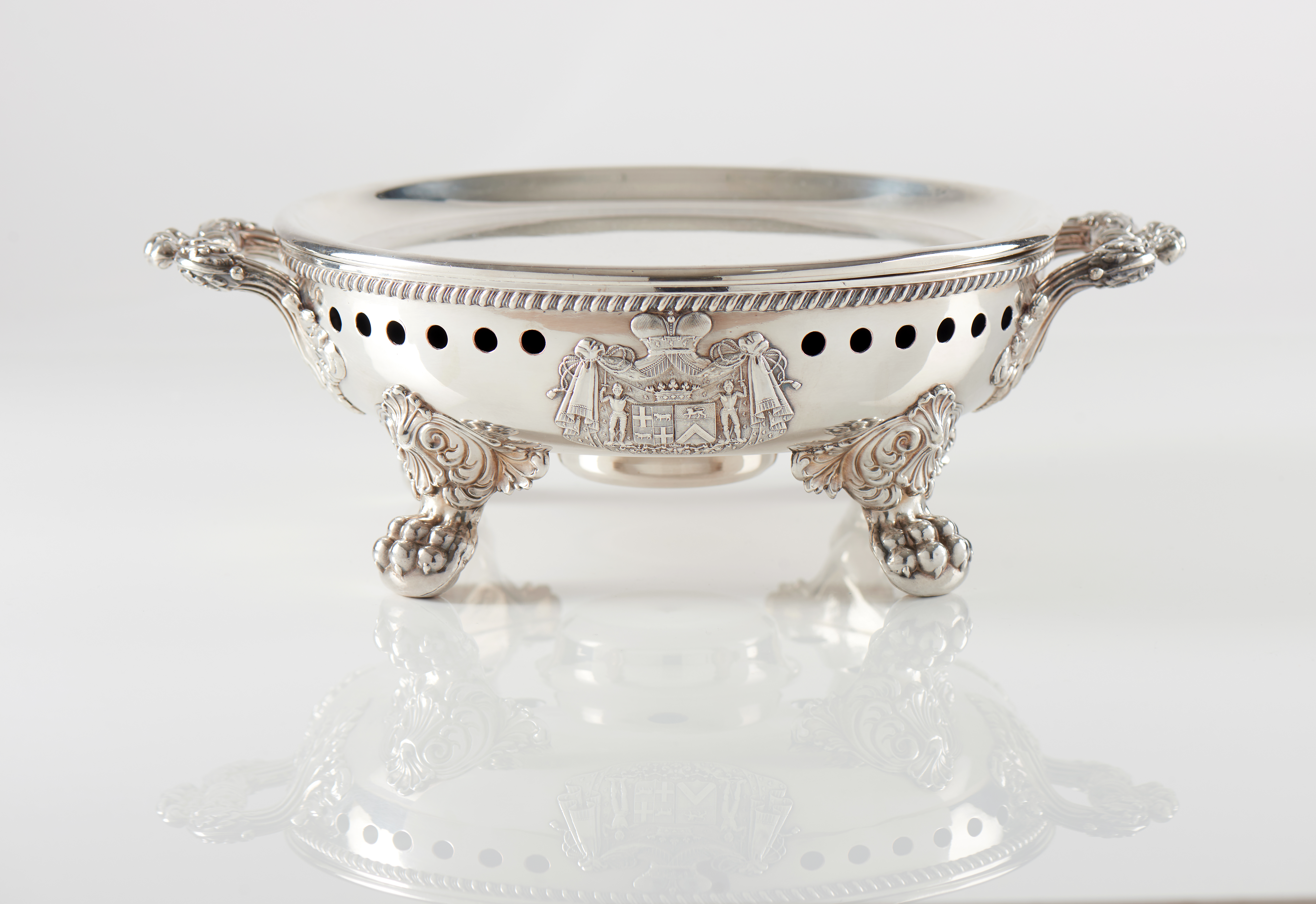 Fabricante Charles-Nicolas ODIOT, em metal prateado de formato circular, o bordo de friso de gomos com pegas de folhagem, e decoração de conchas e acantos assente sobre 4 pés de garras com elementos de palmetas afrontadas e enrolamentos de folhagem
