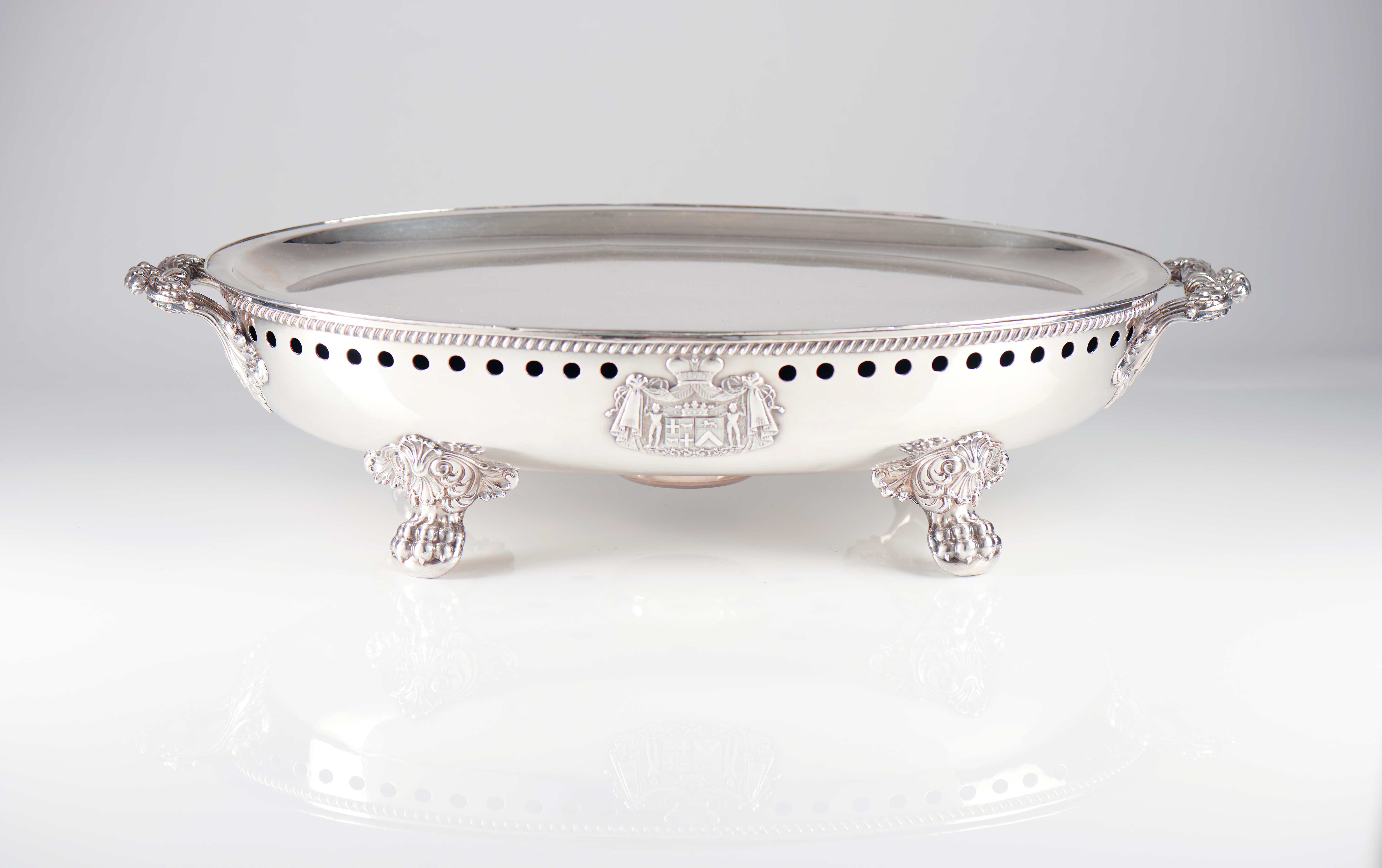 Fabricante Charles-Nicolas ODIOT, em metal prateado de formato circular, o bordo de friso de gomos com pegas de folhagem, e decoração de conchas e acantos assente sobre 4 pés de garras com elementos de palmetas afrontadas e enrolamentos de folhagem