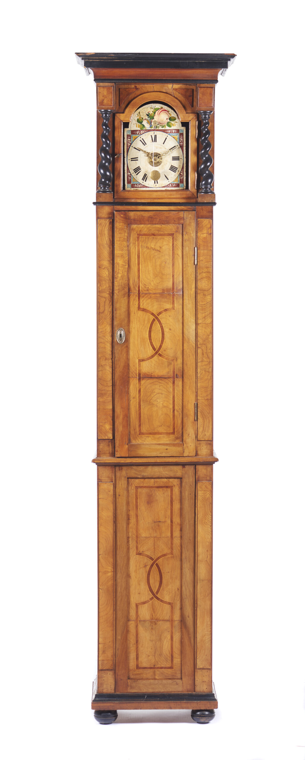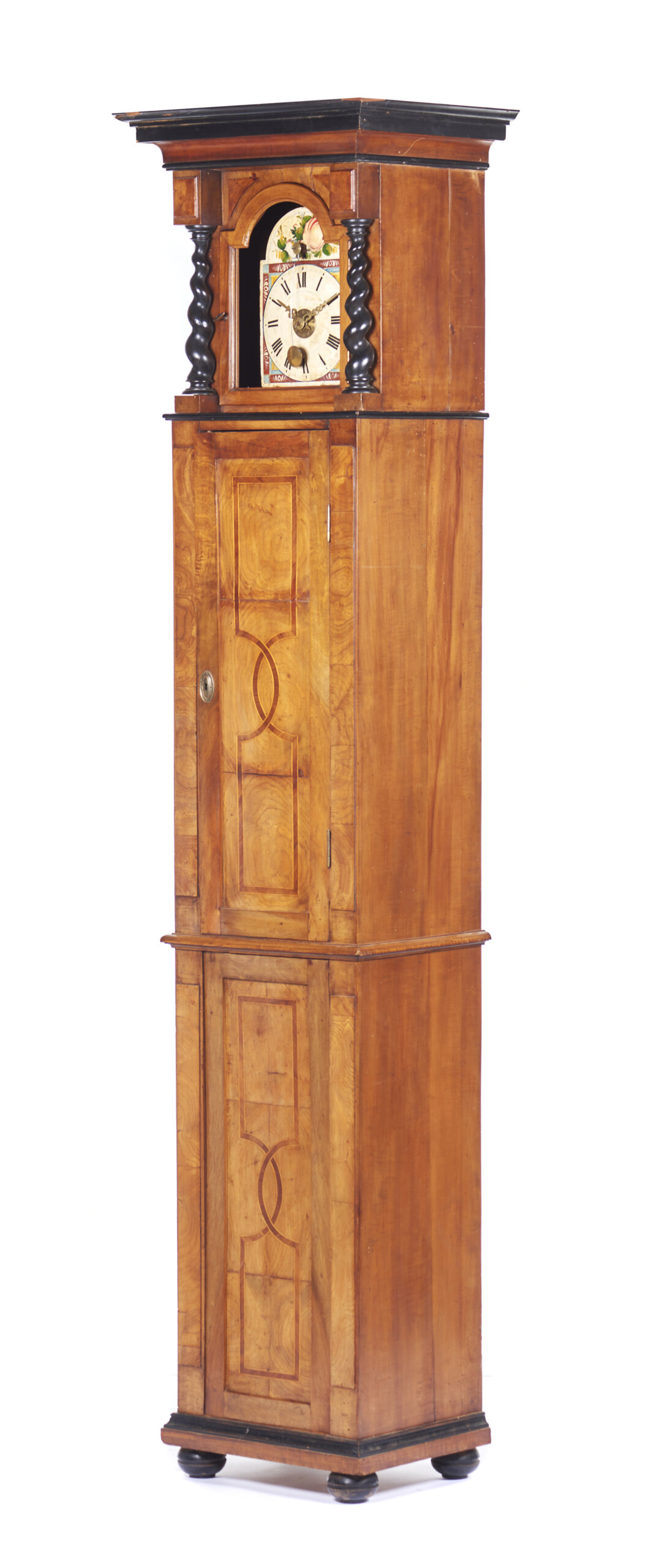 Caixa retangular flanqueada por colunas torneadas em madeira ebanizada