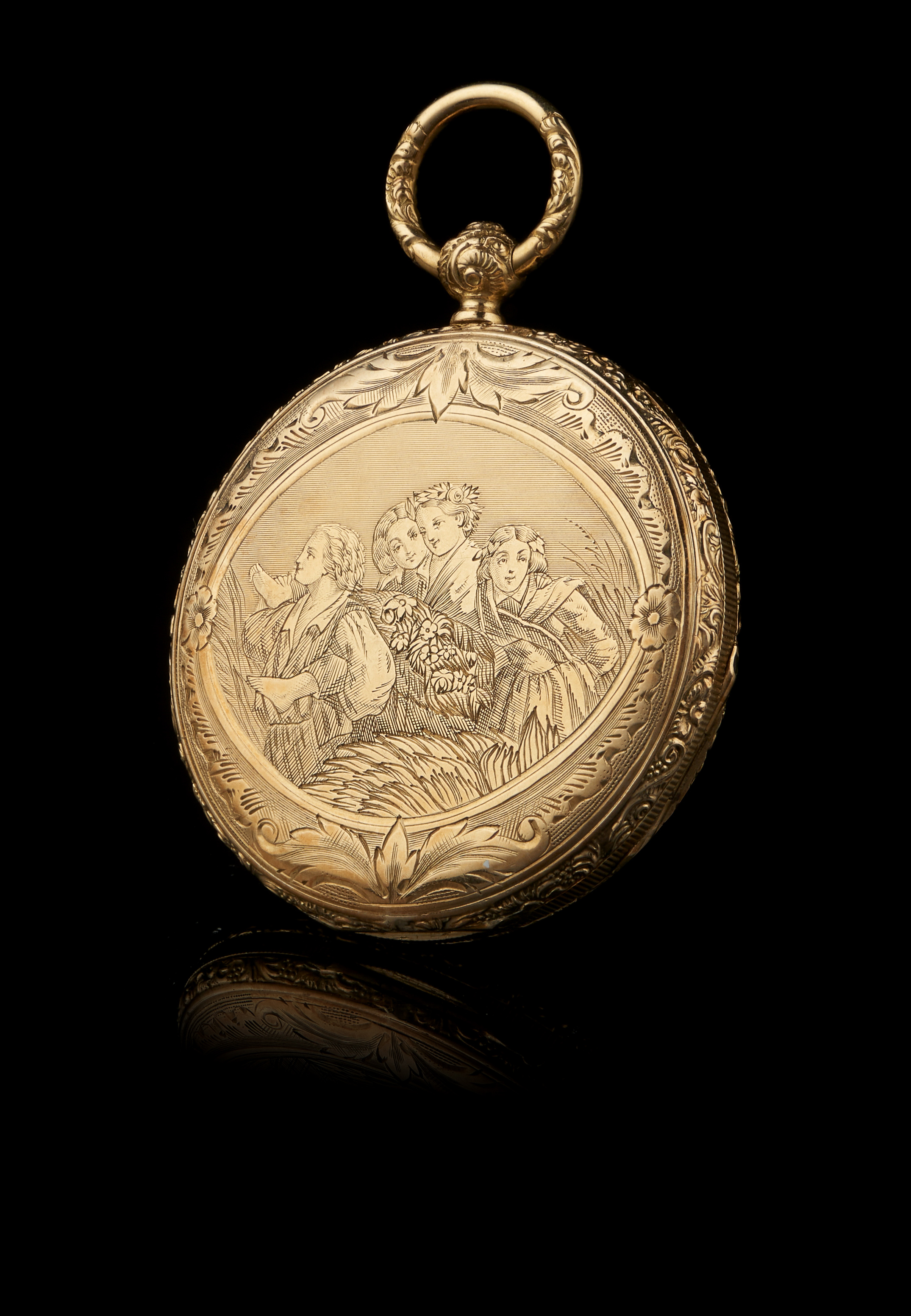 Decorações gravadas com cenas de festa campestre e vista de vale com casario, rio e ponte