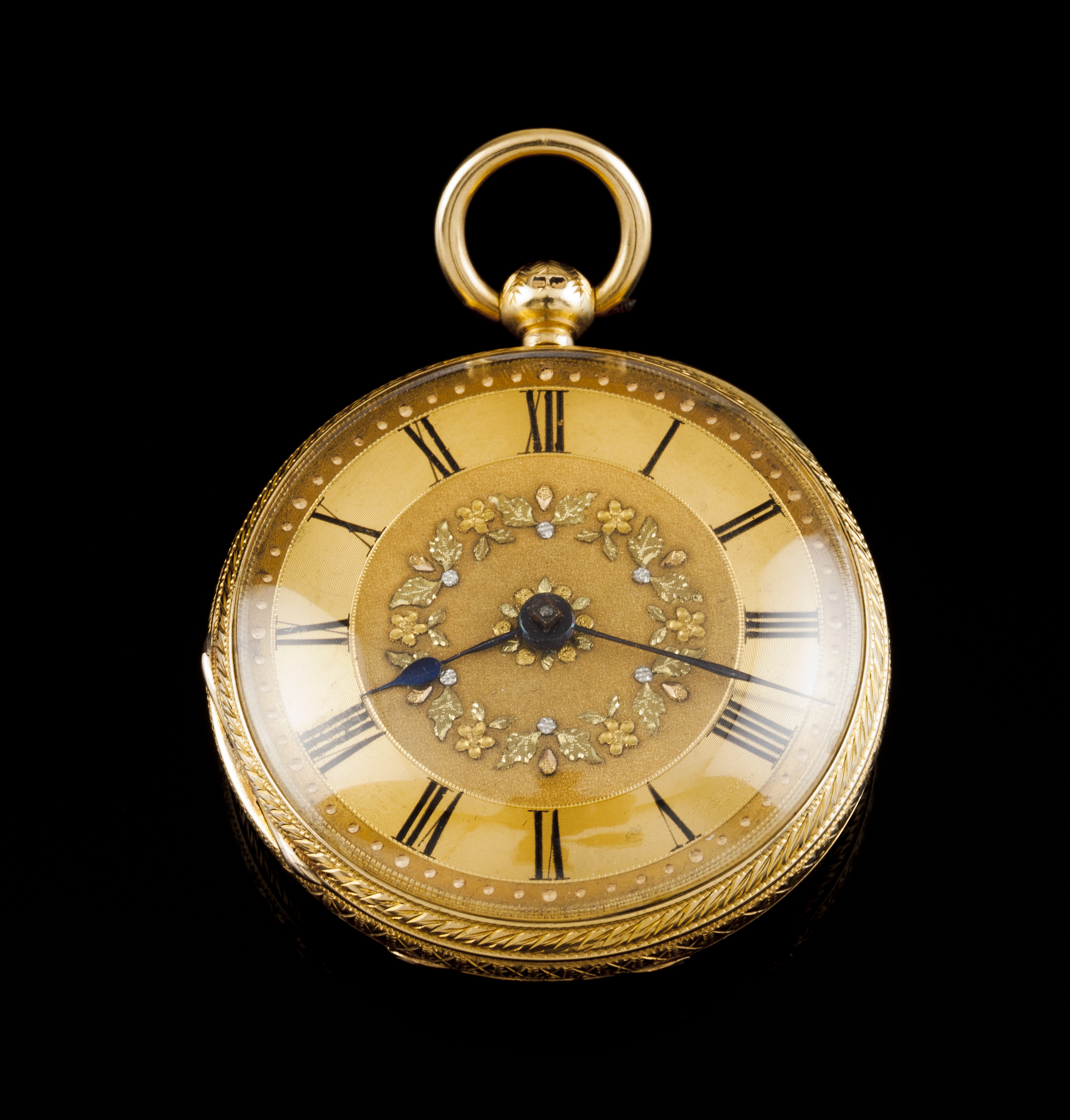 Mostrador dourado com numeração romana decorado com aplicação de cercadura de flores