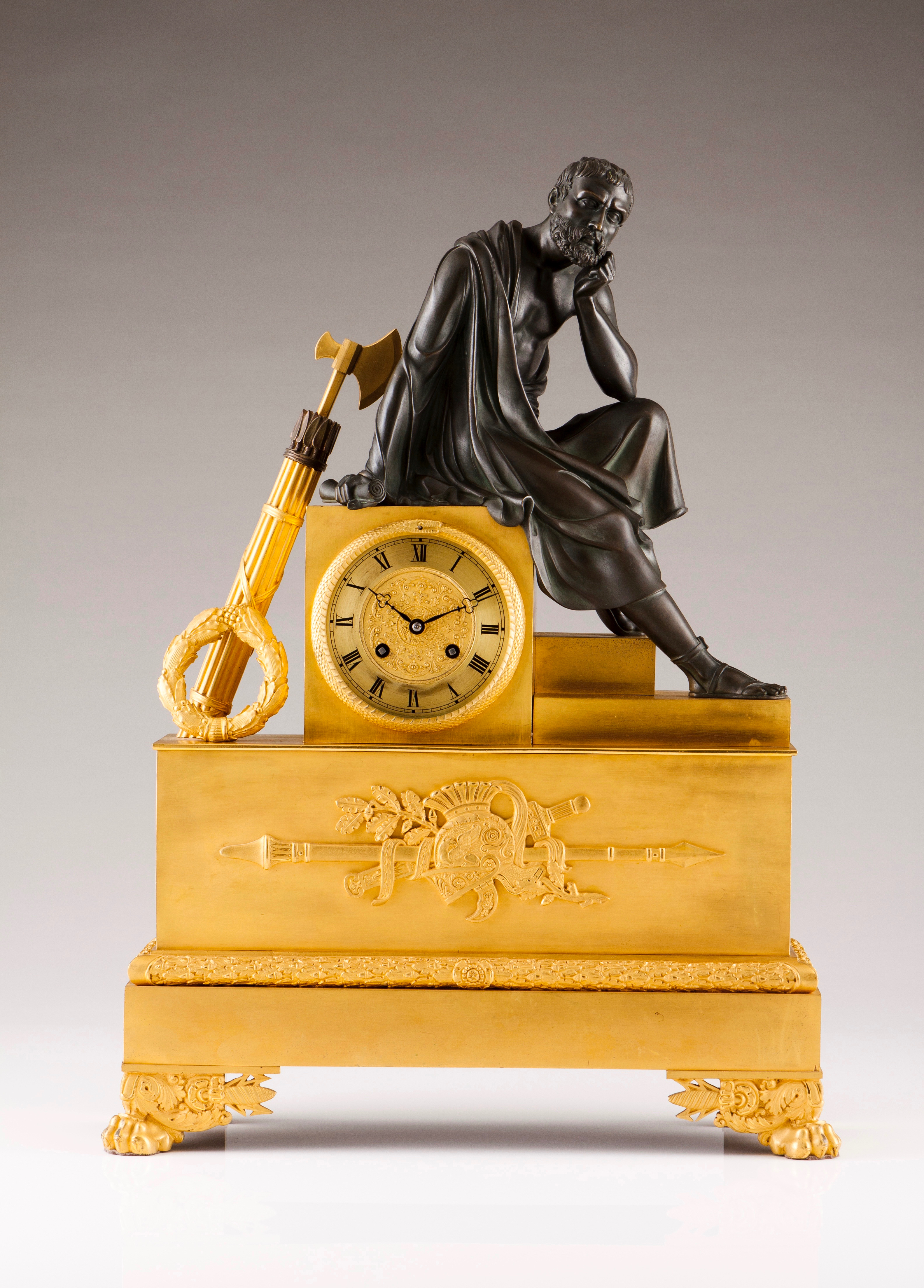 Mostrador com numeração romana e decoração em baixo relevo enquadrado por figura de pensador em bronze patinado, com lanças, alabarda e coroa de louro