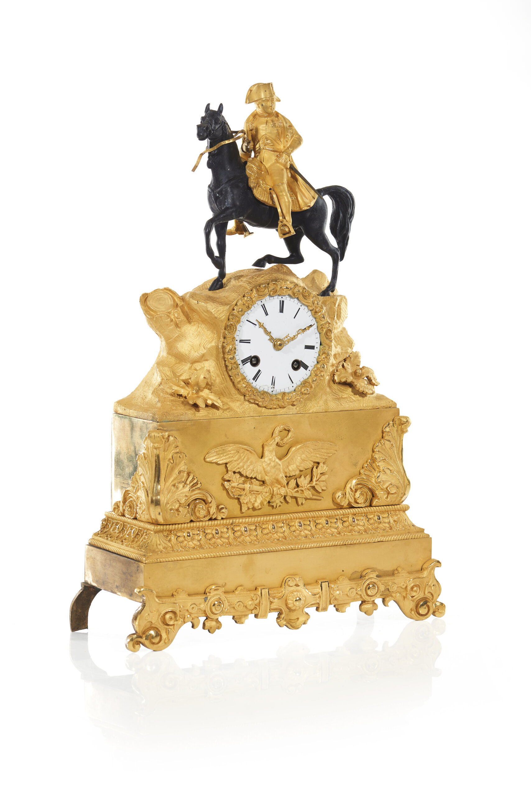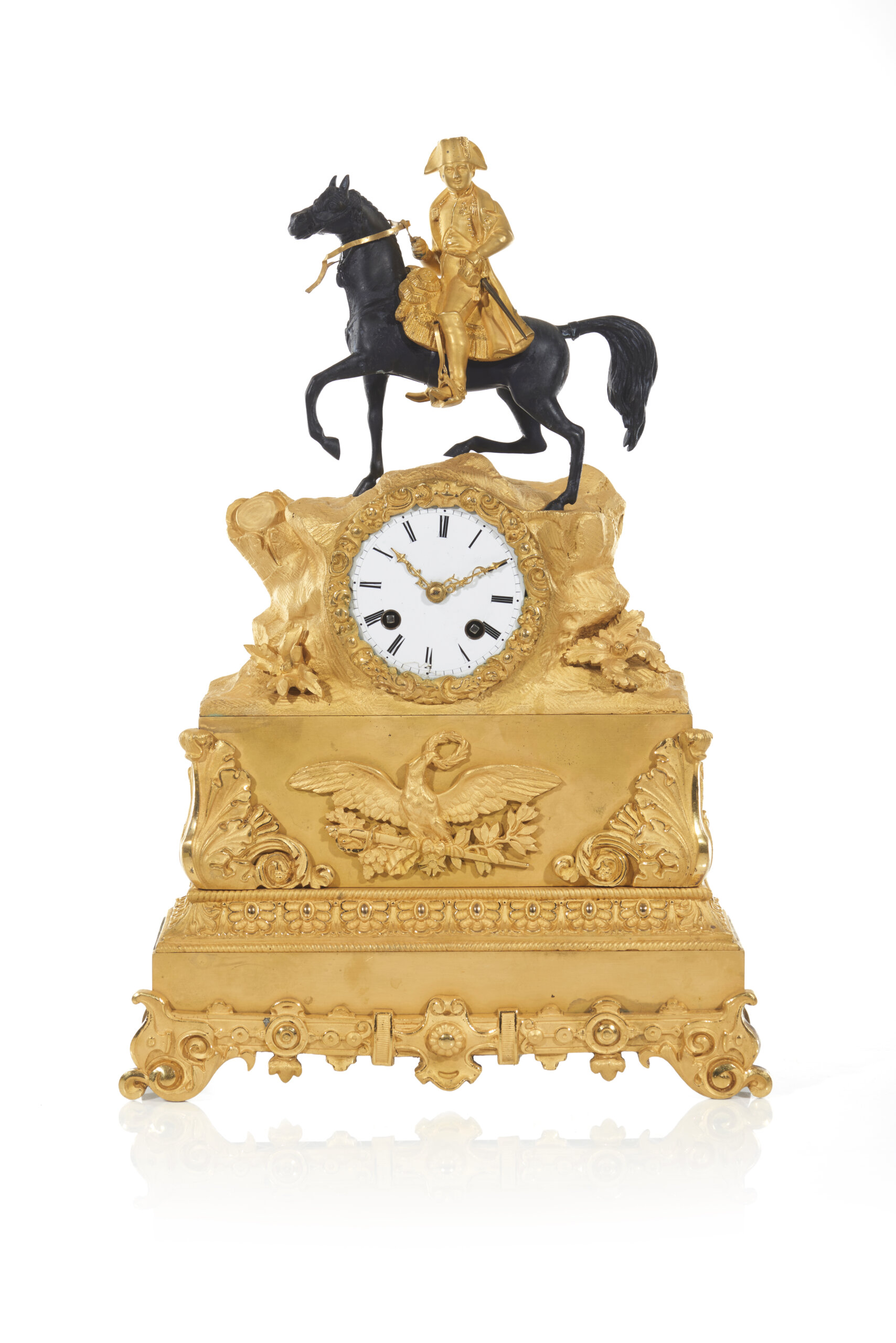 Encimado por grupo escultórico representando Napoleão em pose equestre, montado num cavalo ao passo, envergando uniforme e bicorne, sobre formação rochosa, ao centro da qual se insere mostrador circular em esmalte branco com numeração romana
