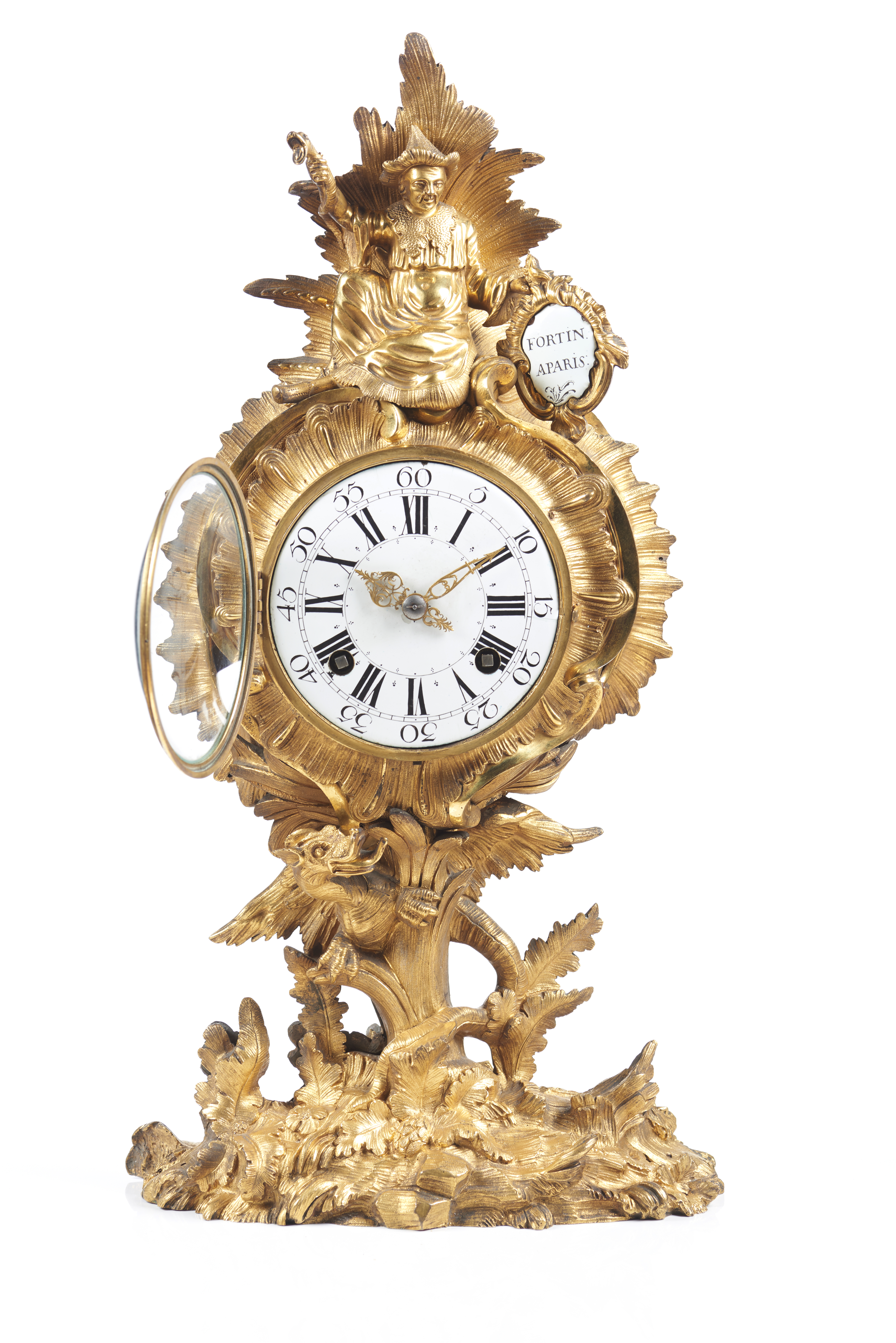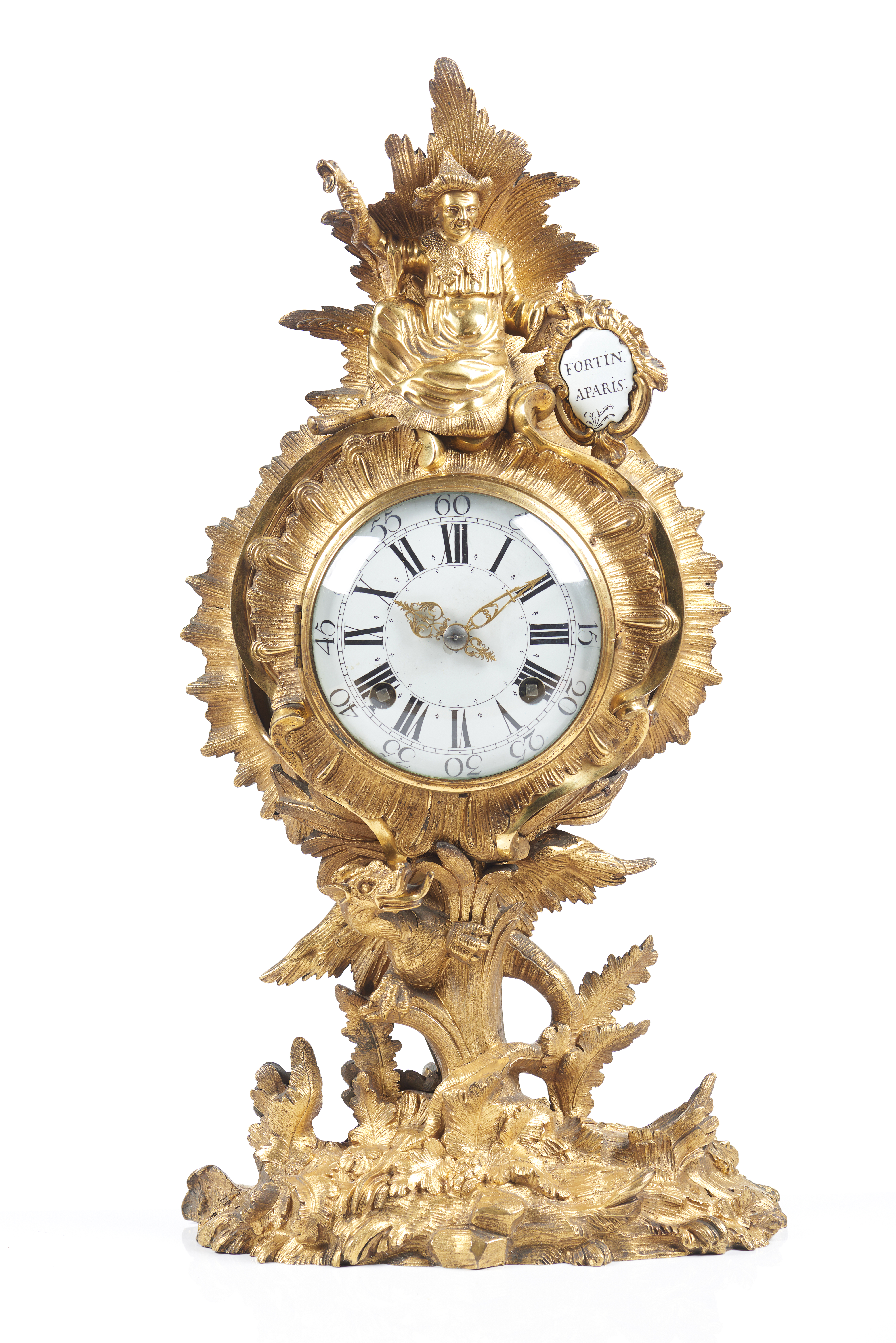 Encimado por uma figura de mandarim sentado, segurando um cetro e uma cartela esmaltada com a assinatura "Fortin à Paris"