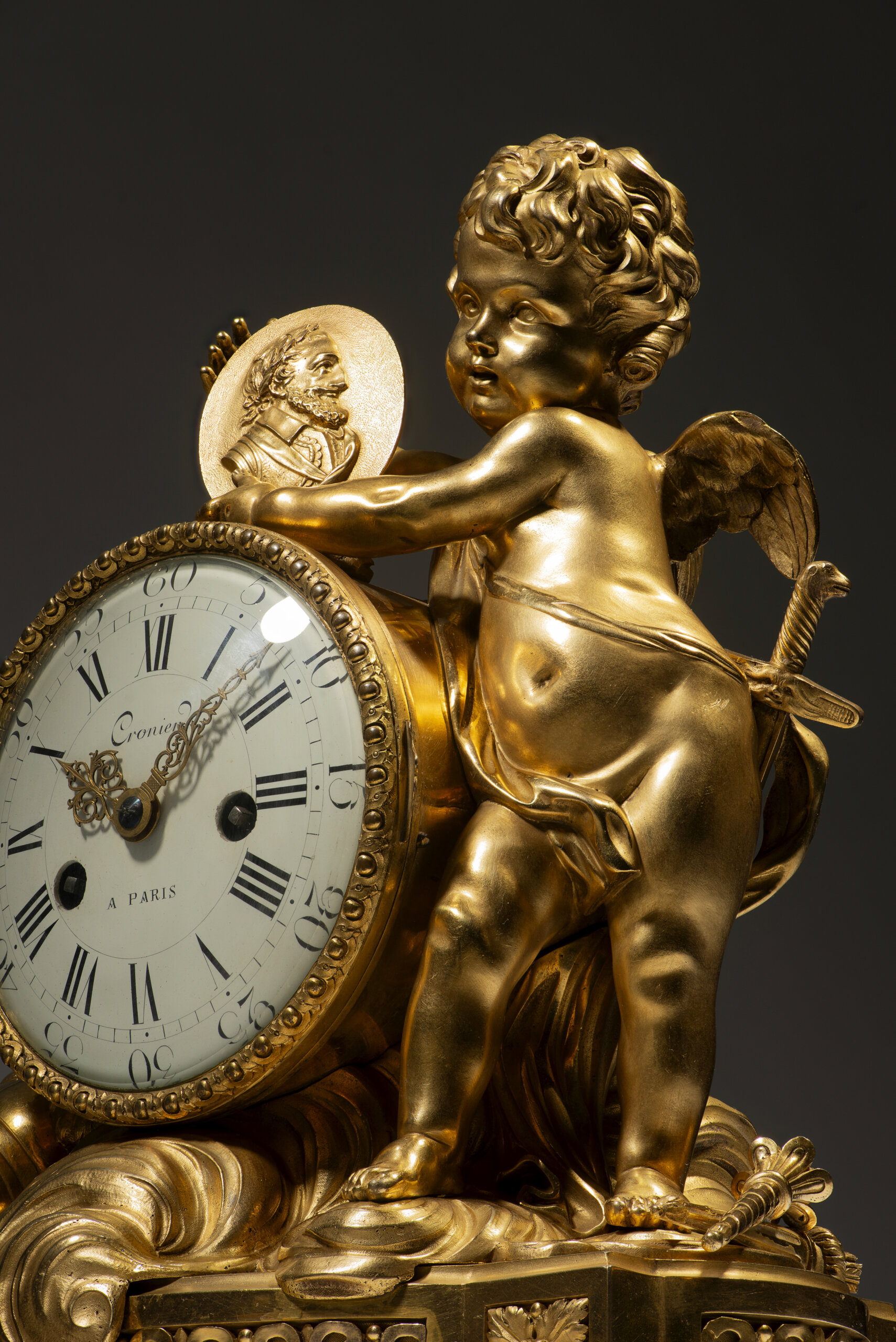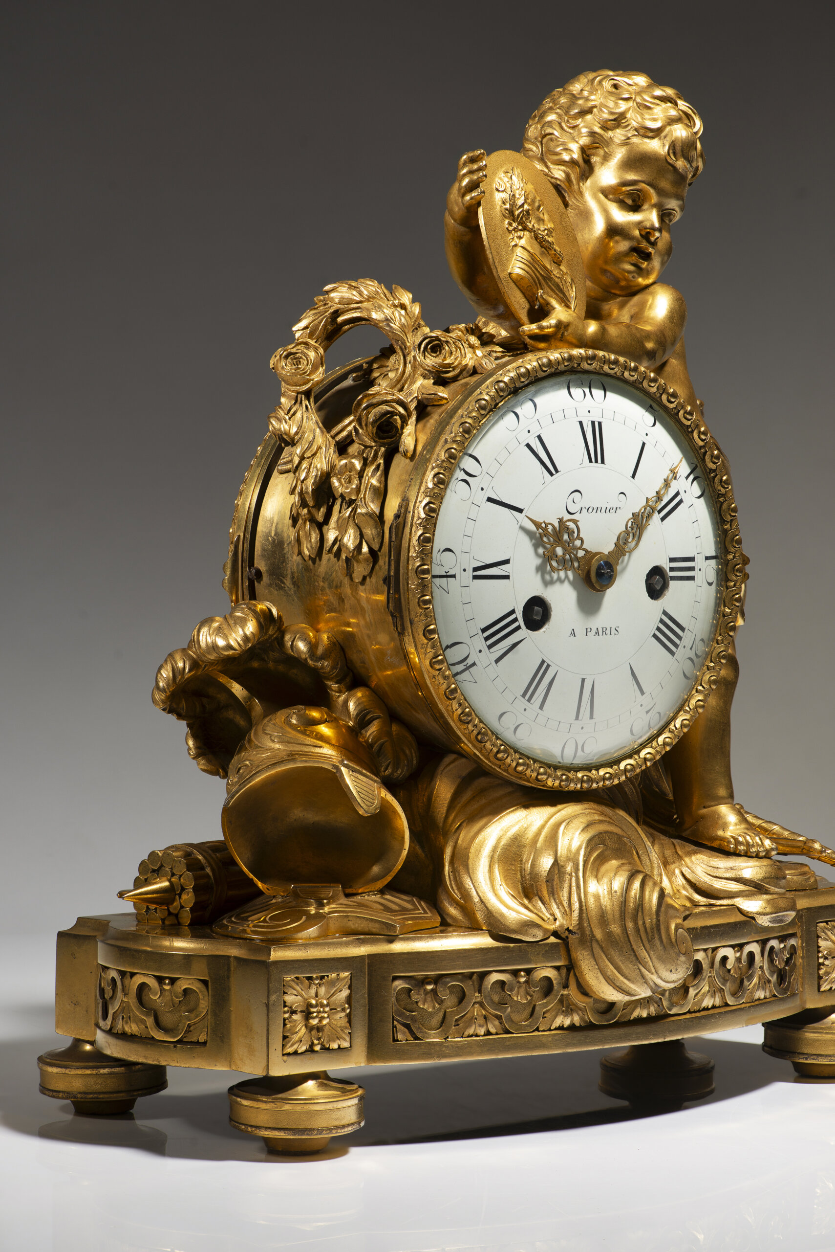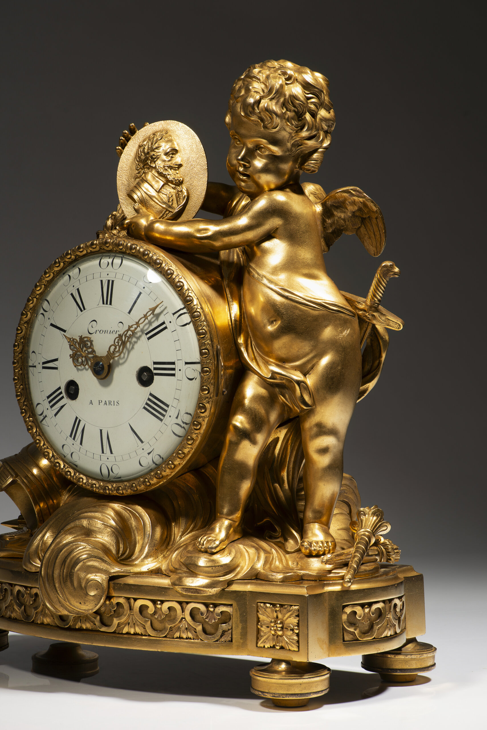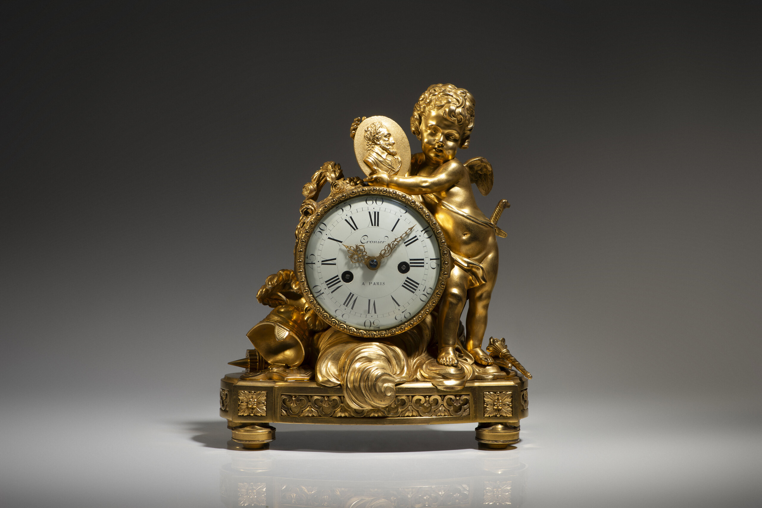 Em bronze dourado e cinzelado, com mostrador em esmalte branco, assinado Cronier à Paris, com numeração romana para as horas e árabe para os minutos