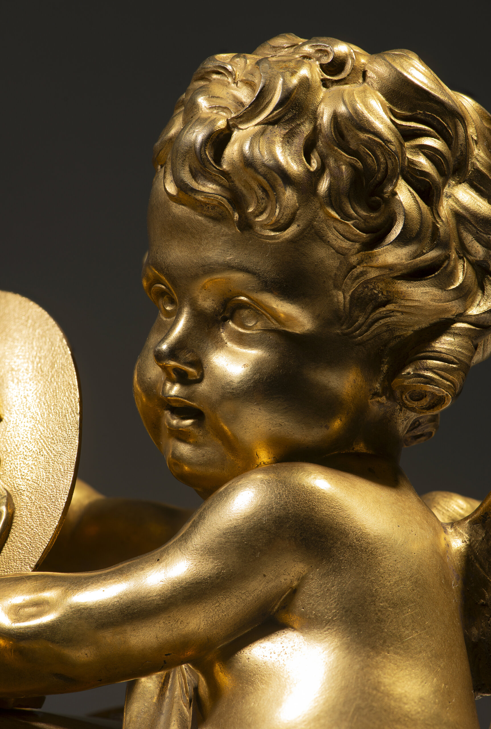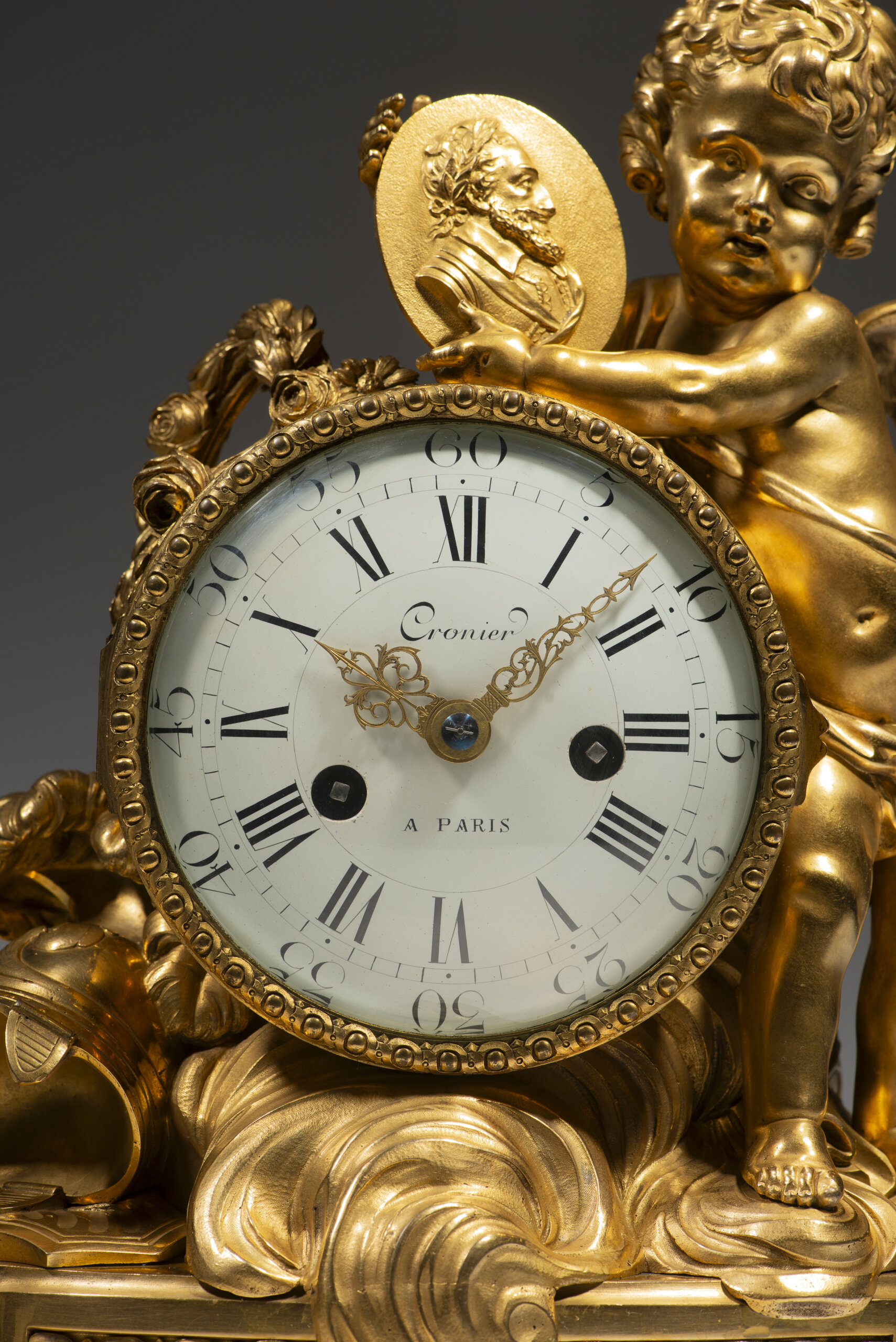 Caixa encimada por figura de amour alado, sobre nuvens, segurando um medalhão oval com o perfil em relevo do rei Henrique IV