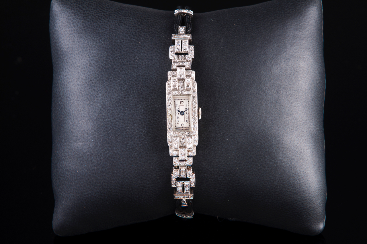 Em platina cravejada com pequenos diamantes talhe 8/8, pulseira em cordão negro com passadeiras em platina e diamantes