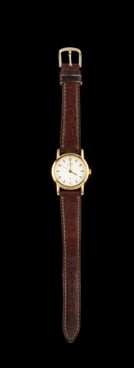 Caixa redonda em plaqué ouro. Pulseira em pele castanha. Movimento quartzo.