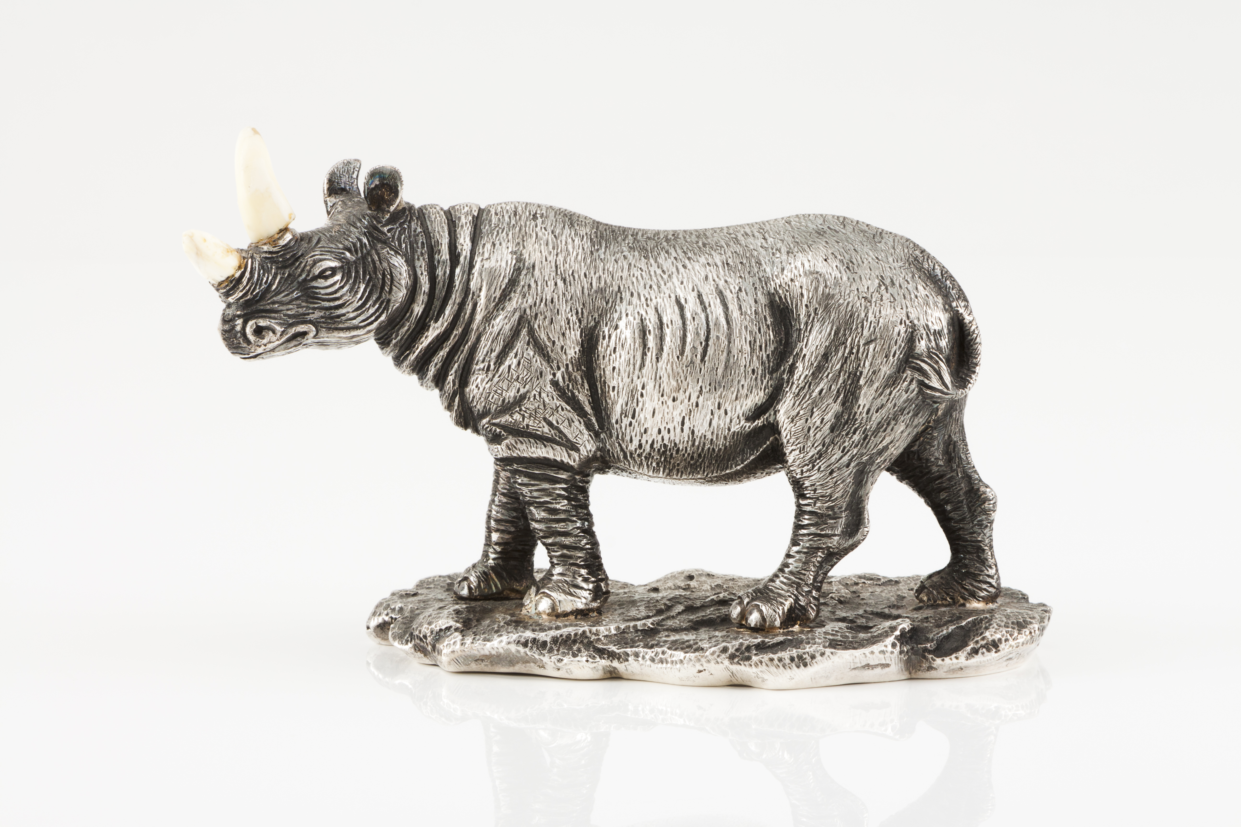 Escultura em vulto perfeito, representando rinoceronte com dois chifres em osso