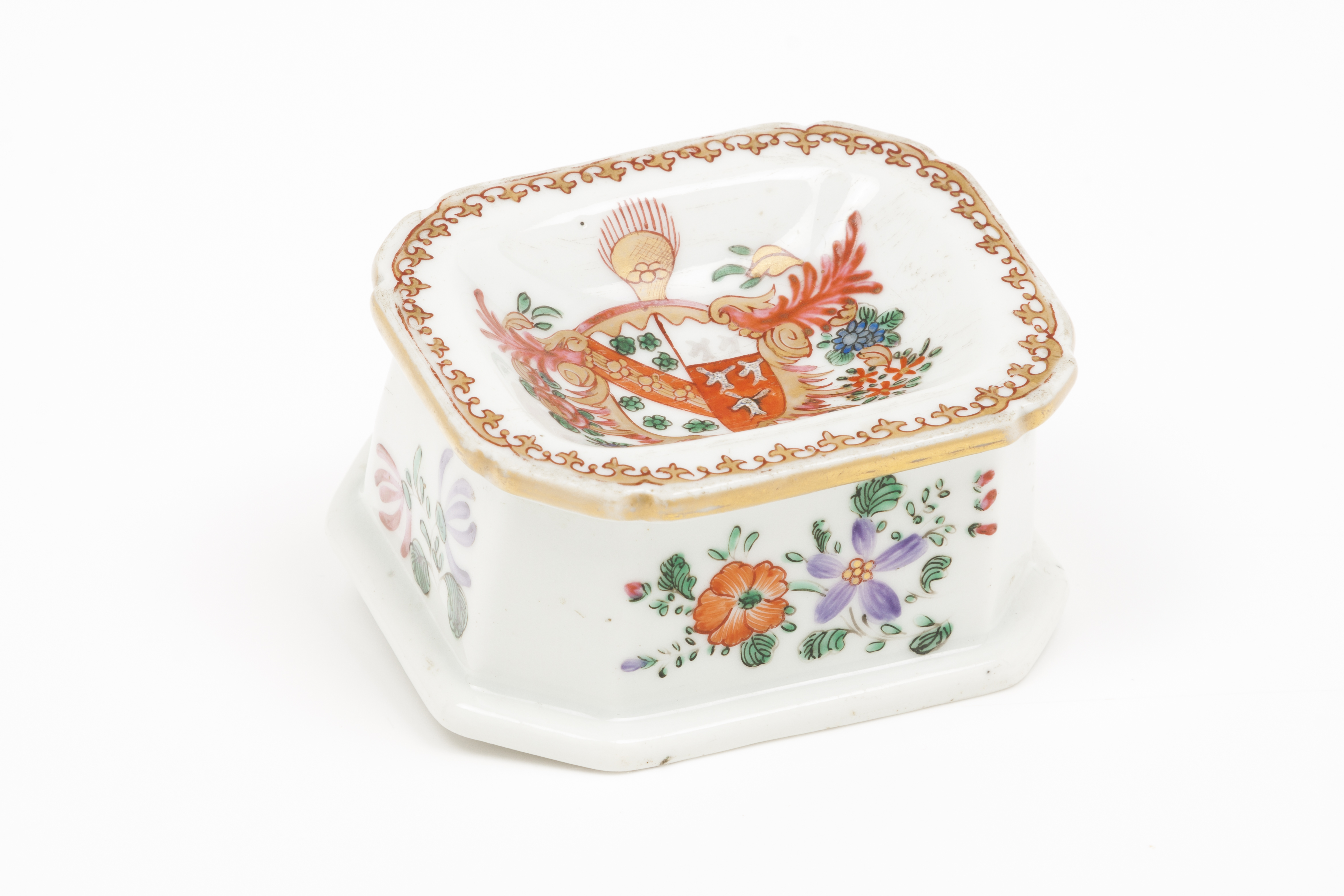 Decoração policromada e dourada representando brasão de armas de família europeia e motivos florais