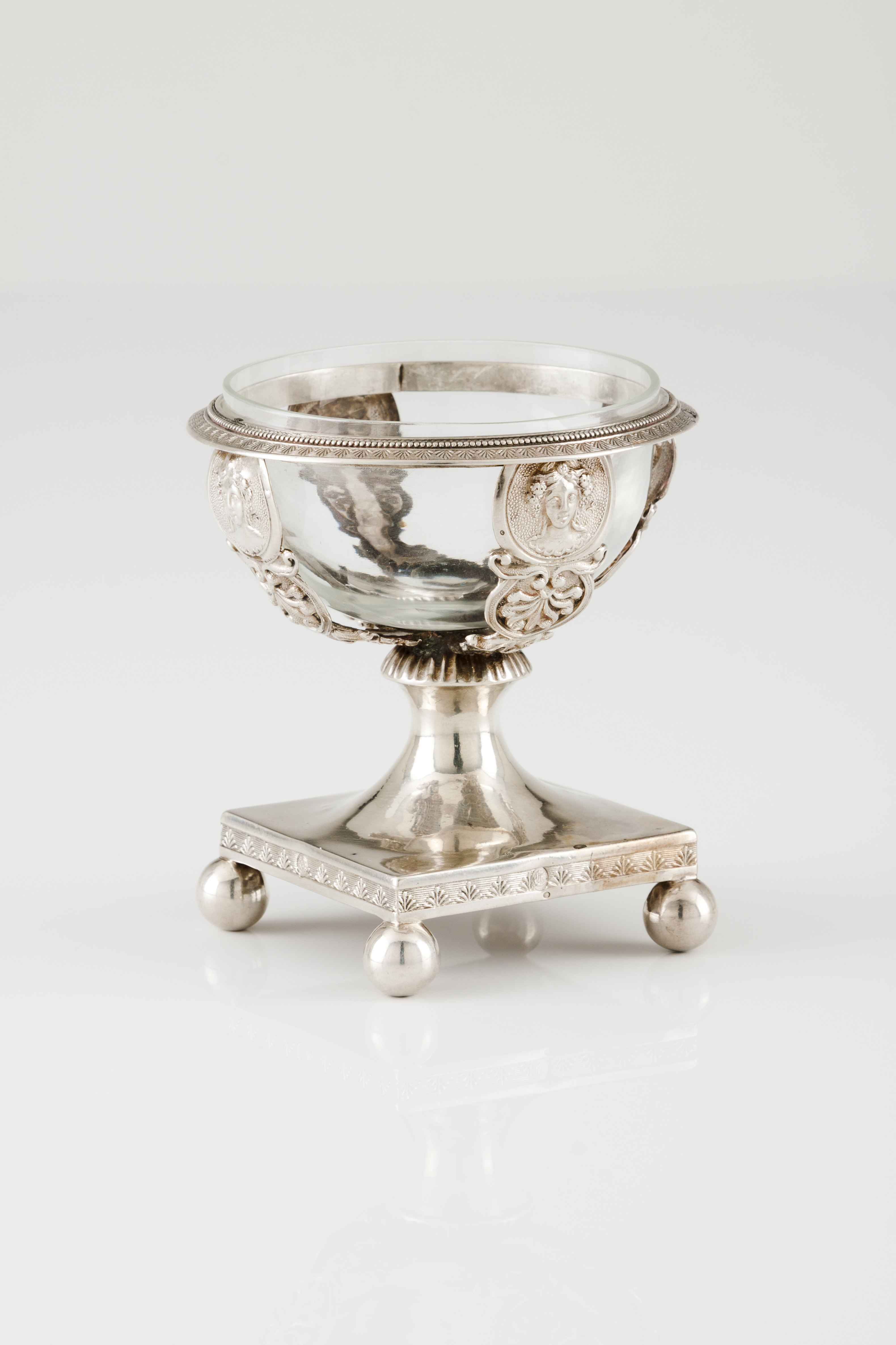De formato circular em pedestal decorado com palmetas e frisos de perlados e 4 elementos verticais com figuras femininas clássicas sobre elementos vegetalistas. Quatro pés de bola. Alma em vidro antigo
