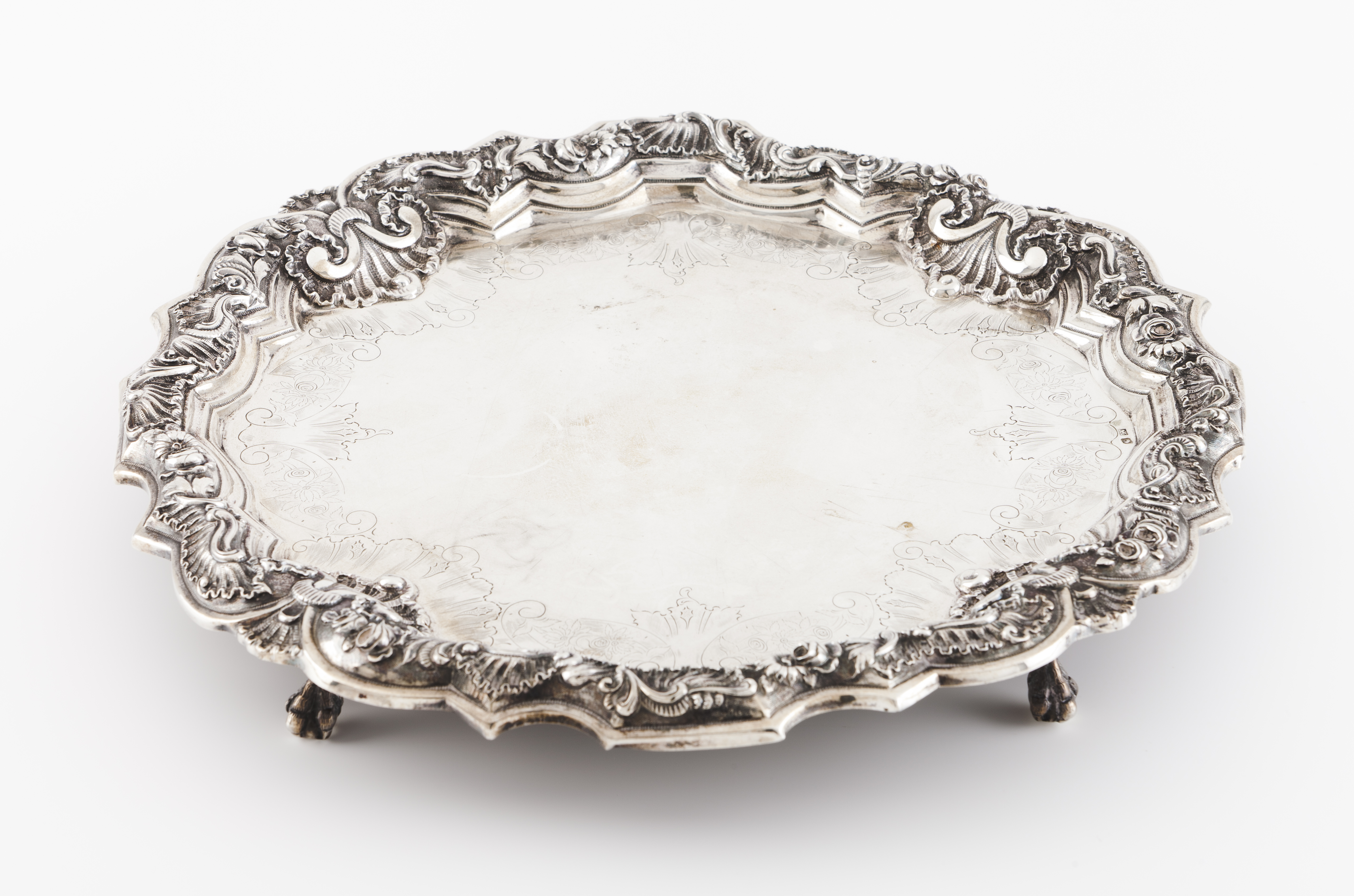 Fundo liso cinzelado com cercadura de folhas de acanto e flores Aba recortada com profusa decoração relevada de flores e folhas de acanto e concheados