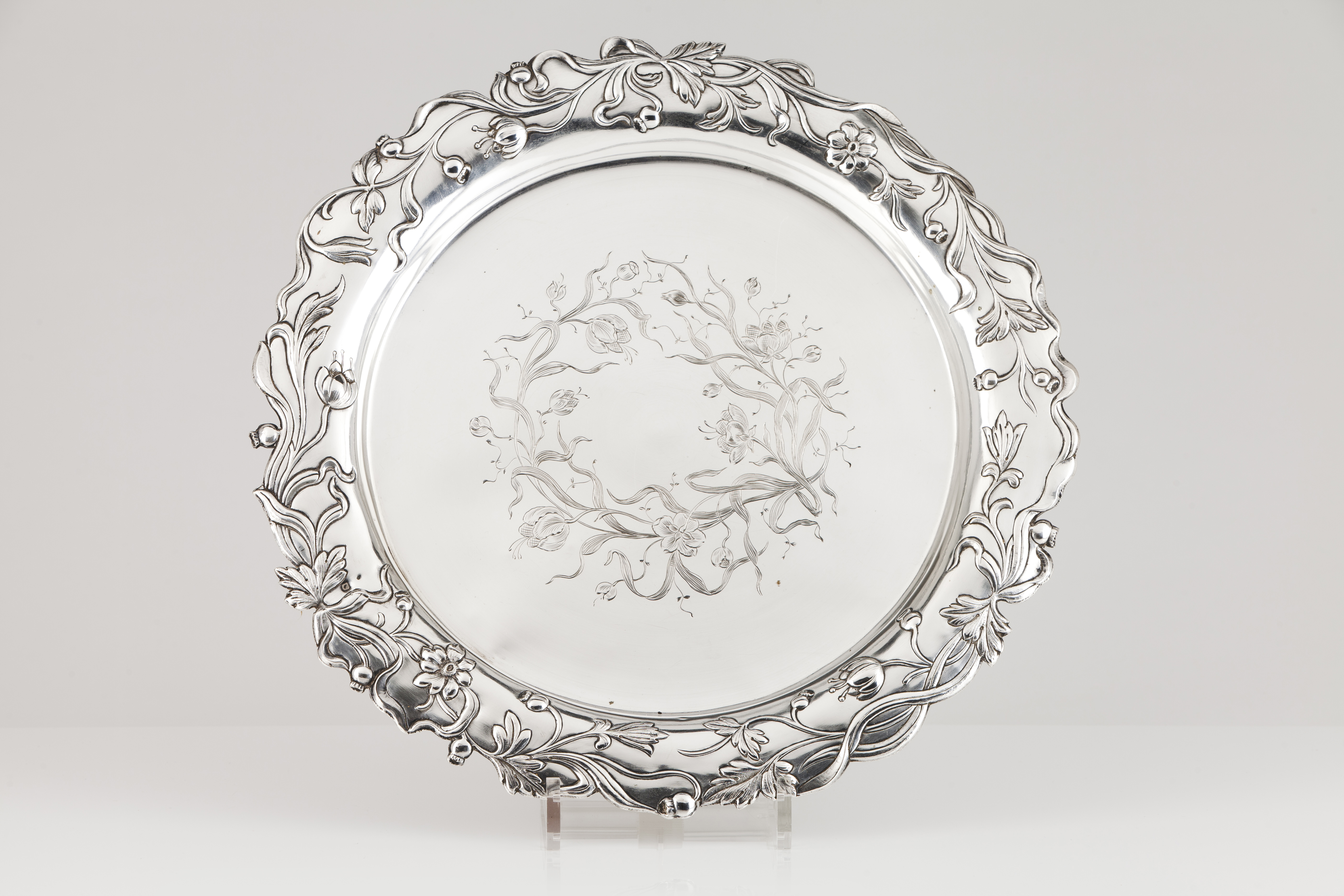 Fundo cinzelado com motivos florais e aba recortada com idêntica decoração relevada