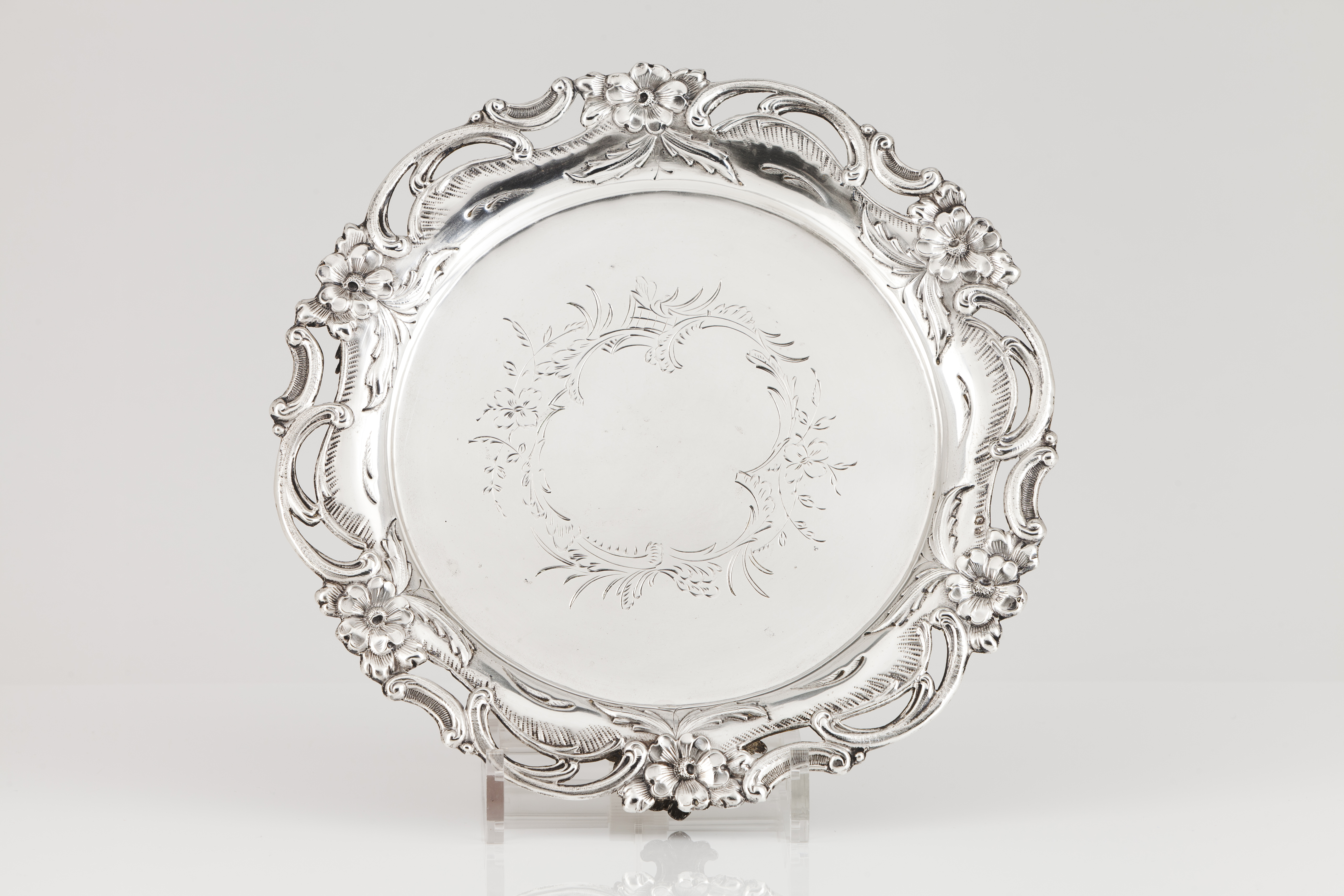 Fundo gravado com motivos florais, aba recortada e vazada com decoração vegetalista