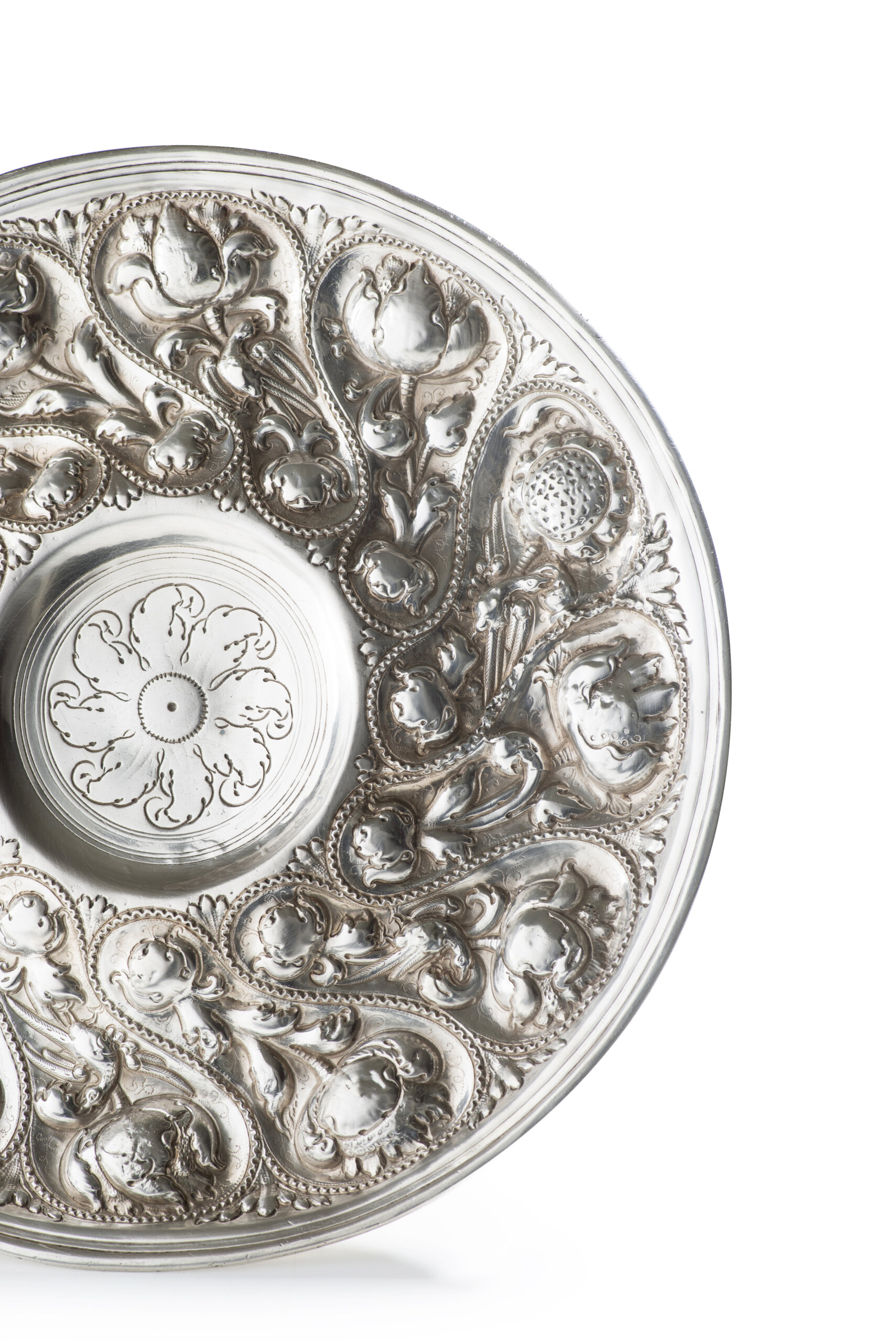 Decoração relevada e gravada representando aves, flores e folhas